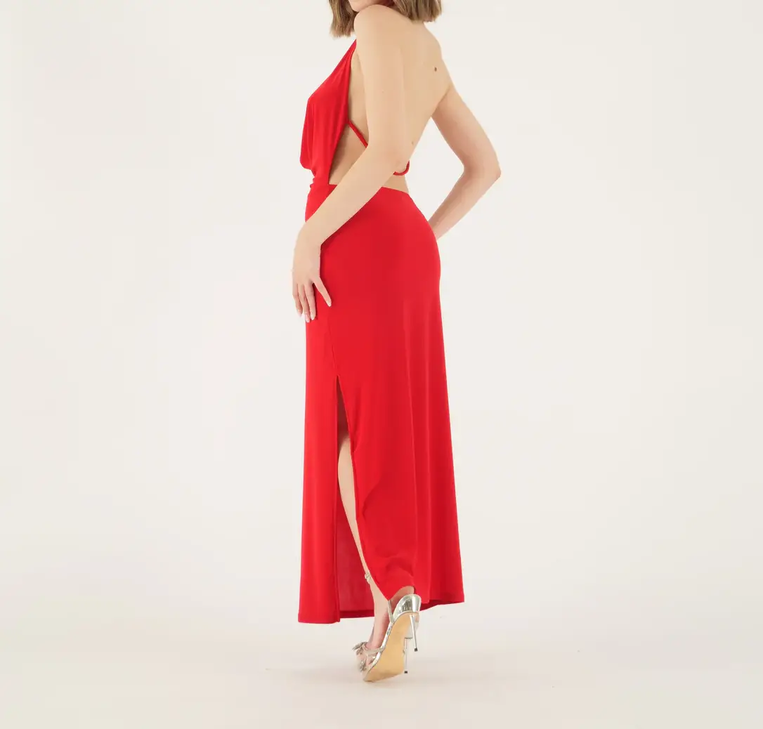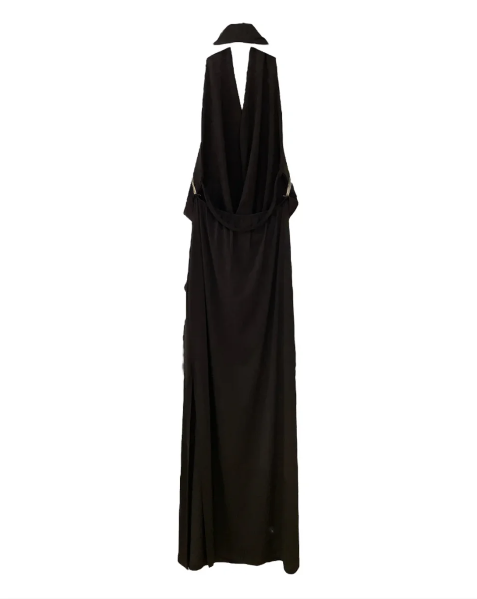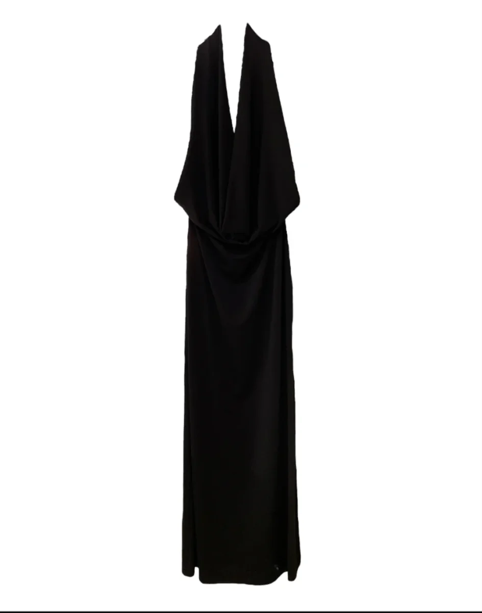 Vestito longuette in tessuto elasticizzato tipo jersey. Scollo profondo a cascata sul davanti e schiena scoperta con fascetta sottile. Spacco laterale. Vestibilità aderente. Composizione tessuto 95% poliestere 5% elastan.