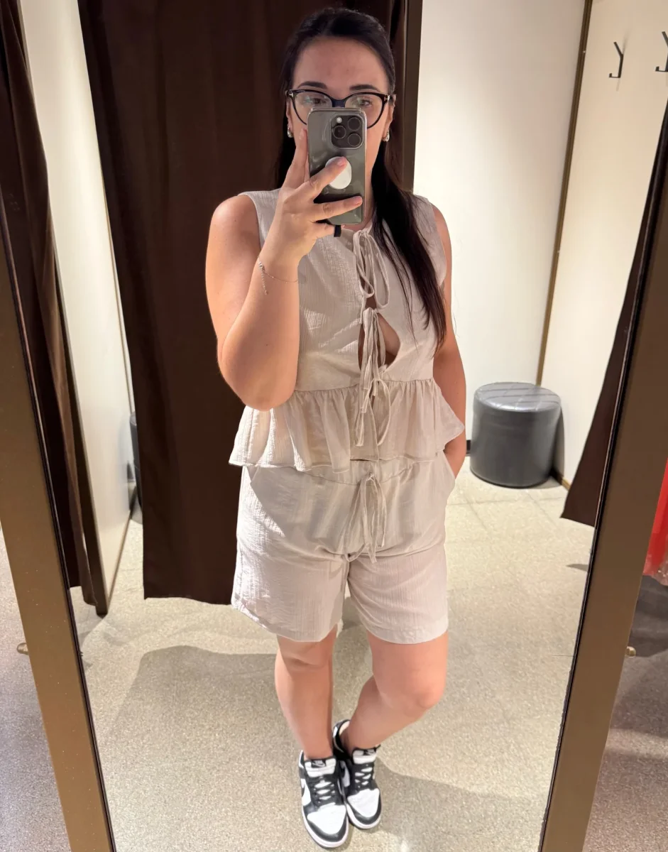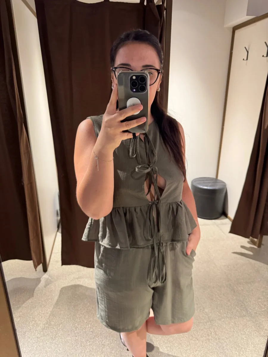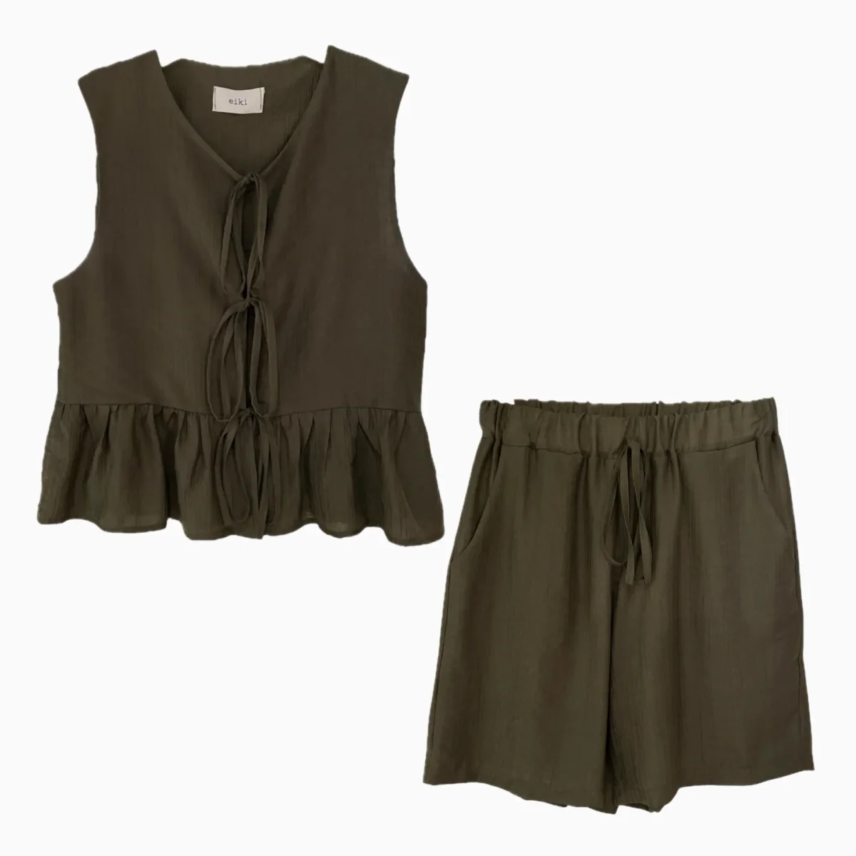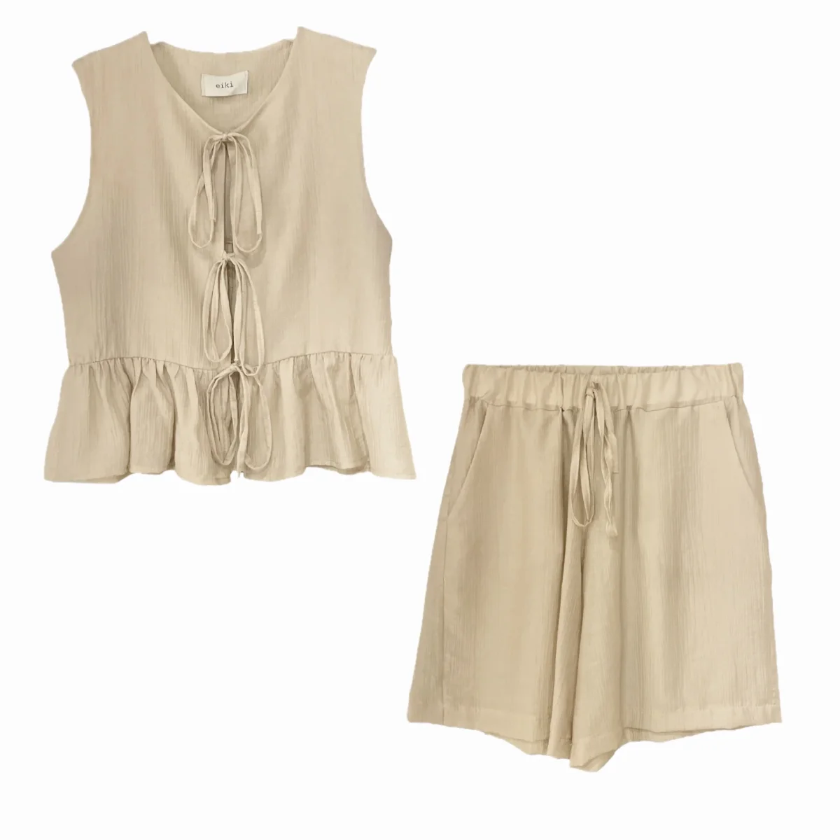 Coordinato in tessuto misto viscosa. Top con laccetti sul davanti e rouches sul fondo. Shorts con elastico in vita, lunghezza a metà gamba. Vestibilità regolare, taglia in foto M. Composizione tessuto 80% viscosa 20% nylon.