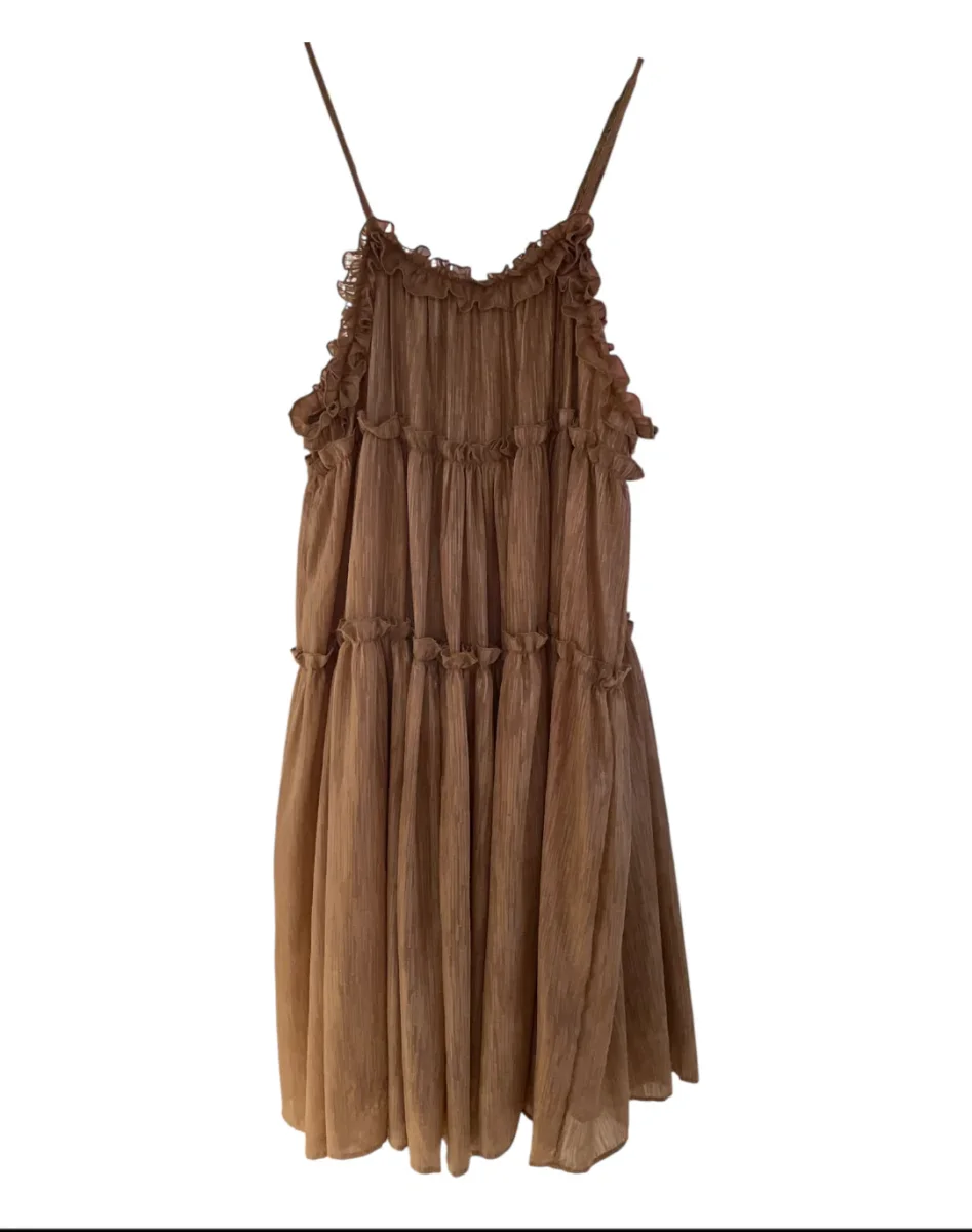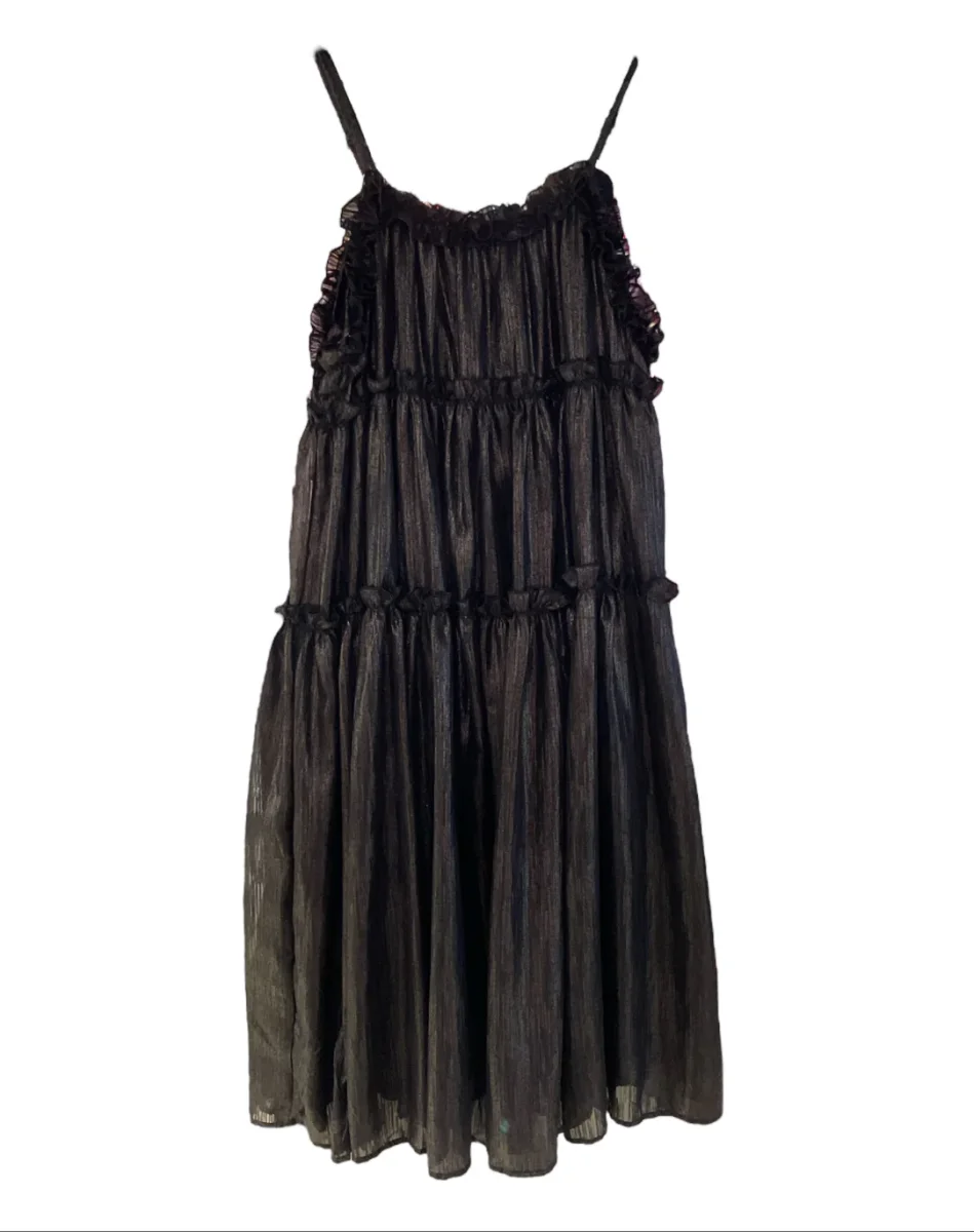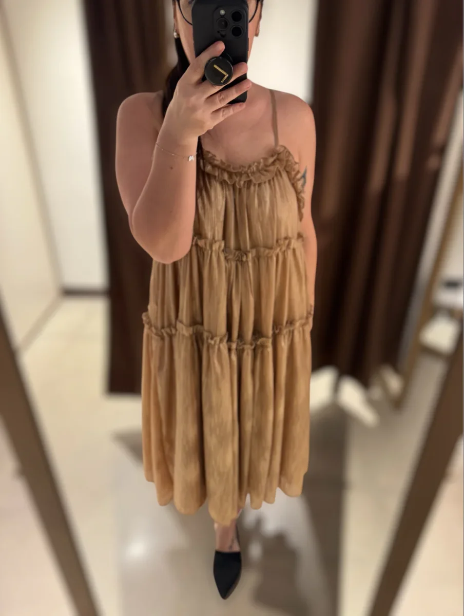 Vestito midi a balze in tessuto glitterato effetto spalmato. Bretelle sottili regolabili, scollo tondo, rouches sulle cuciture. Vestibilità molto ampia.