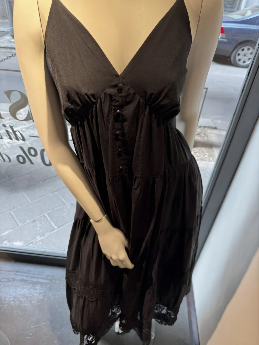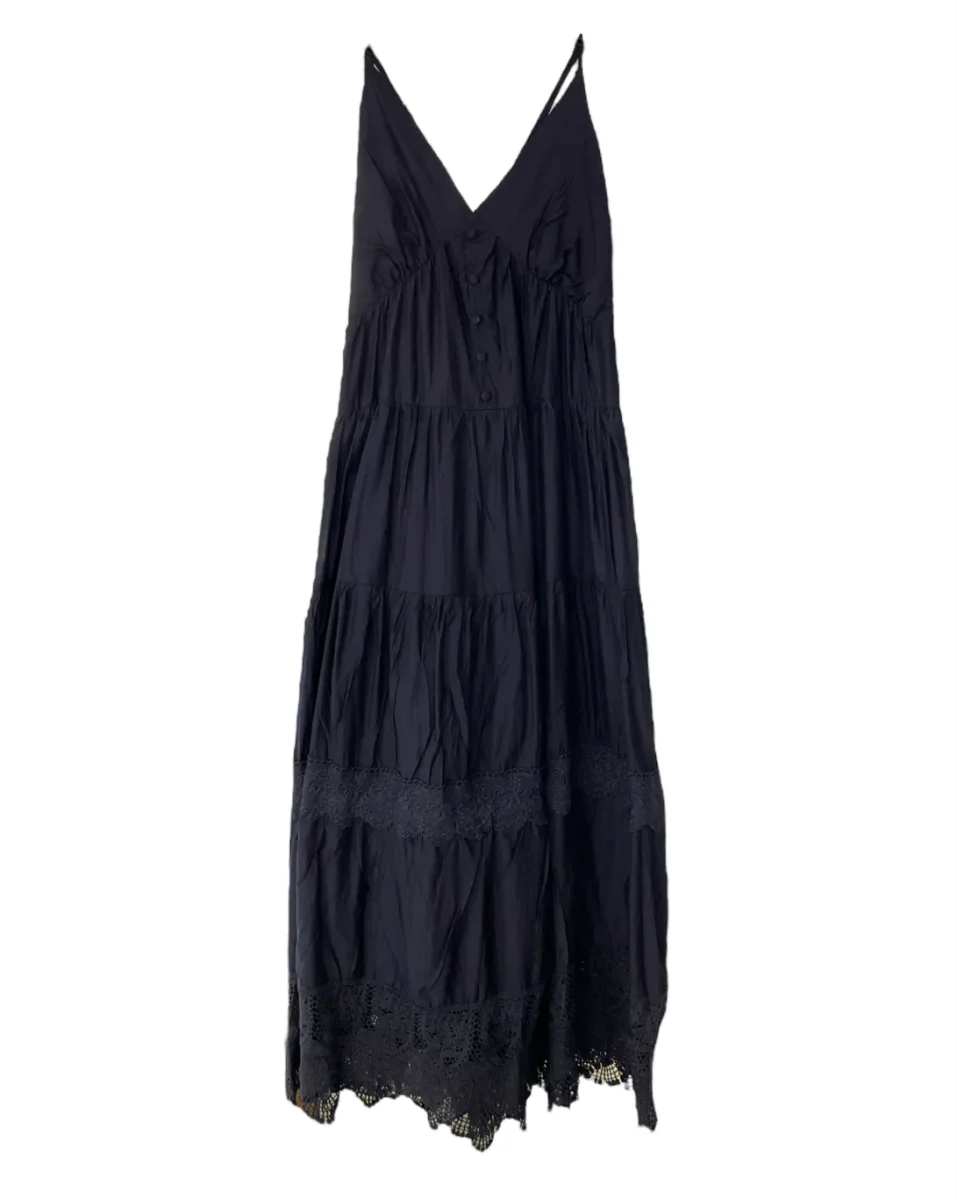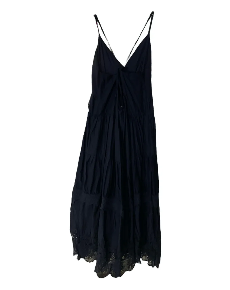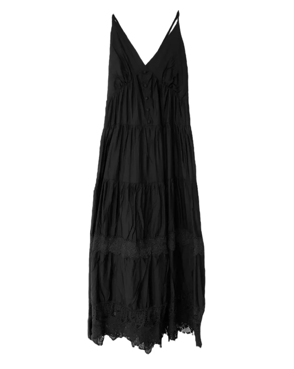 Vestito lungo in tessuto misto cotone effetto stropicciato. Bretelle sottili lunghe che vanno a chiudere sulla schiena, è possibile chiudere con fiocco centrale oppure creare la doppia bretella. Scollo a punta, finta abbottonatura sullo scollo. Taglio in vita, gonna lunga svasata a balze con inserti in pizzo sul fondo. Vestibilità regolare. 20% poliammide, 56% cotone, 24% tencel.