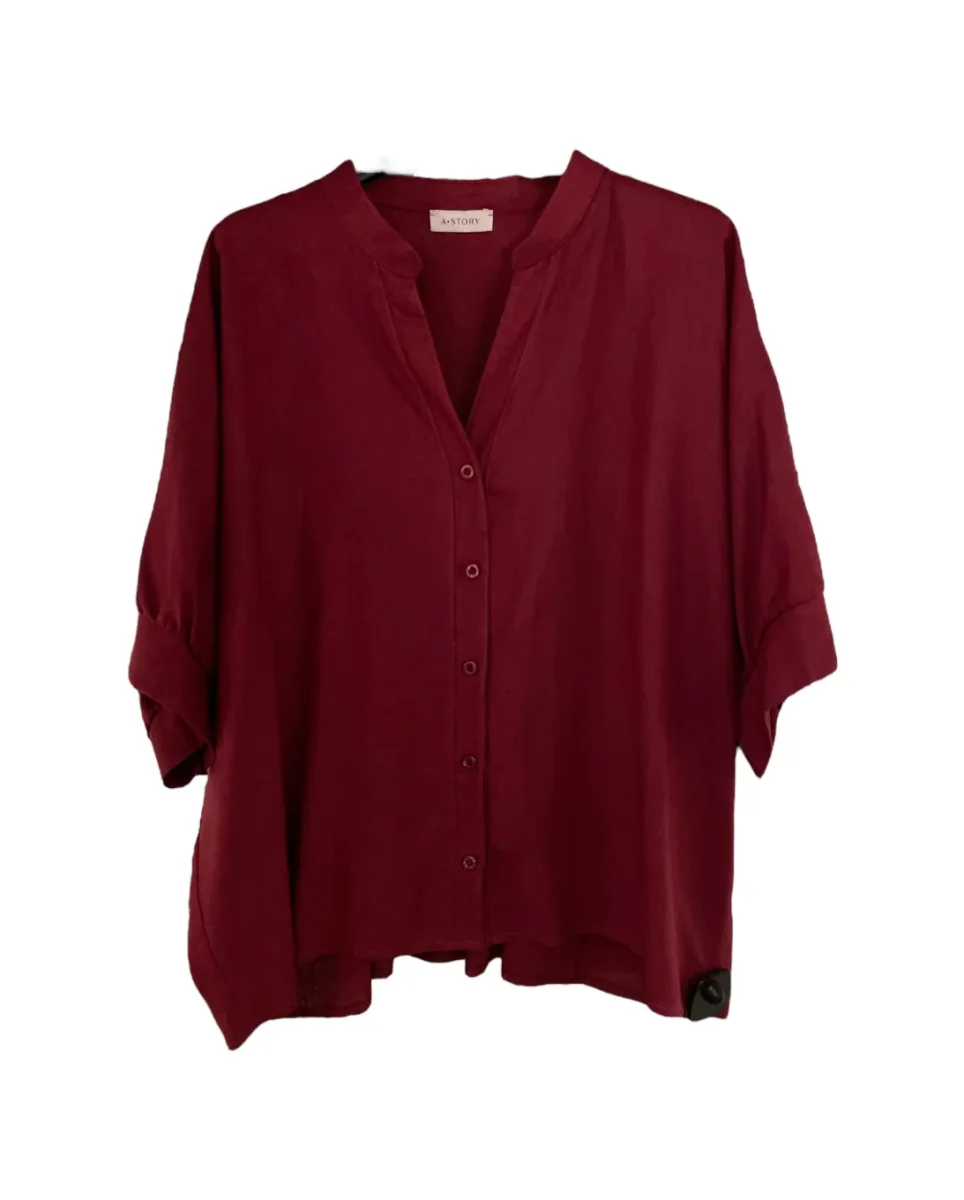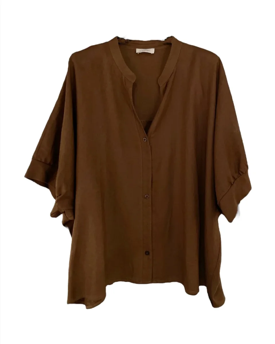 Camicia oversize in tessuto misto lino/viscosa. Collo coreano, scollo a punta ed abbottonatura centrale con bottoni lucidi in tinta. Maniche corte a farfalla con bordo ampio liscio. Vestibilità molto comoda, perfetta anche da portare aperta con un top. Crea il coordinato con il pantalone abbinato. Composizione tessuto 55% lino 45% viscosa.