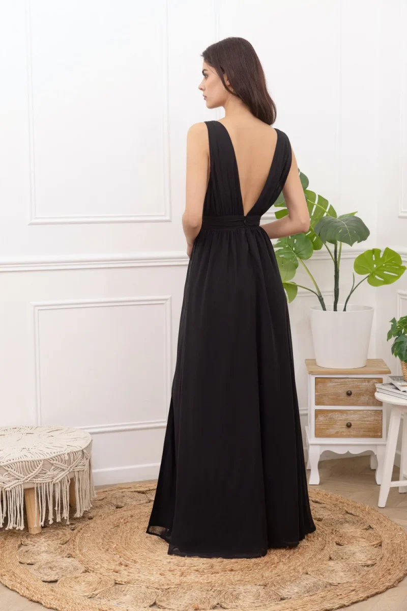 Vestito elegante da cerimonia in tessuto chiffon leggero. Scollo a punta molto profondo con aperture laterali, chiusura con zip a scomparsa. Taglio in vita con fascia fissa, gonna lunga ampia con spacco profondo. Vestibilità regolare aderente in vita. Composizione tessuto 100% poliestere.