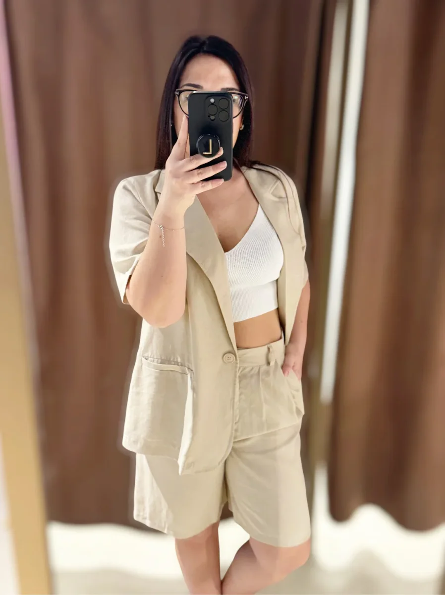 Bermuda leggero in tessuto misto lino. Vita regolare, chiusura con zip e bottone, pences in vita, tasche a filo laterali. Vestibilità regolare.