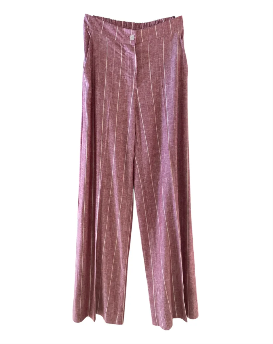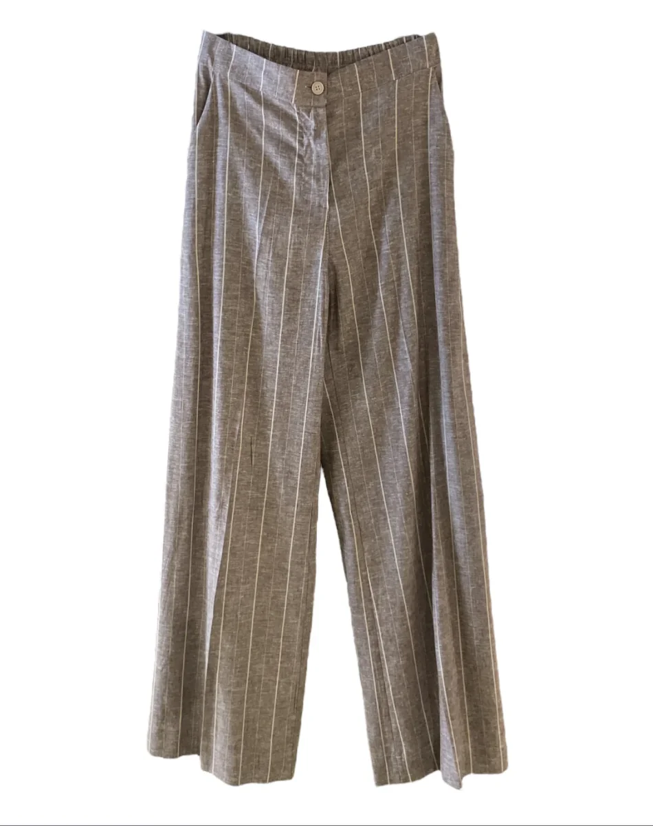 Pantalone palazzo in tessuto leggero misto lino. Vita alta, chiusura con zip e bottone, tasche laterali. Gamba e fondo ampi. Motivo gessato, tessuto lavorato effetto grezzo. Vestibilità regolare. Composizione tessuto 72% viscosa 28% lino. Crea il tailleur con la giacca blazer abbinata.