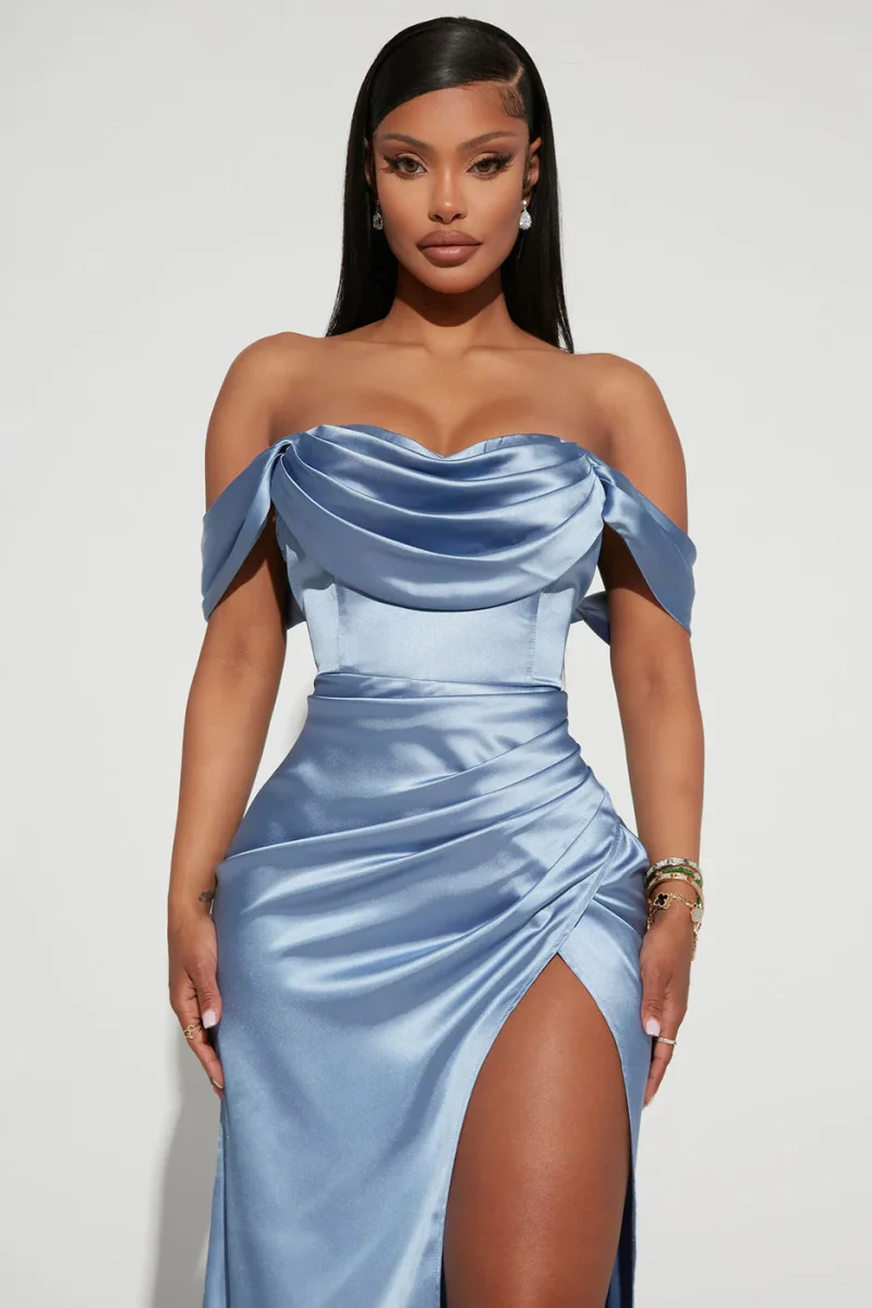 Vestito lungo in tessuto lucido effetto rasato. Corpetto con drappeggio sul davanti ed alette laterali che poggiano sulle braccia o possono diventare bretelle. Taglio in vita, drappeggio laterale sul fianco. Spacco alto. Chiusura con zip sulla schiena. Vestibilità aderente. Composizione tessuto 100% poliestere.