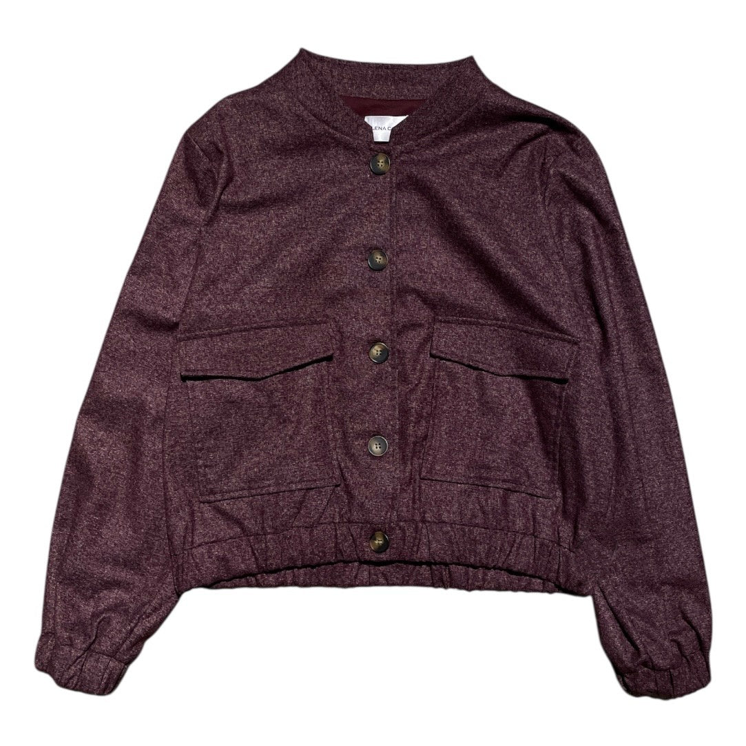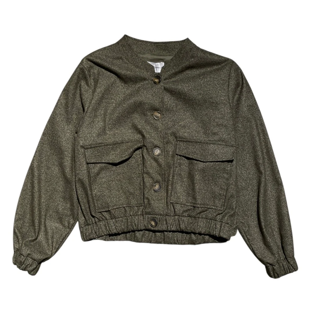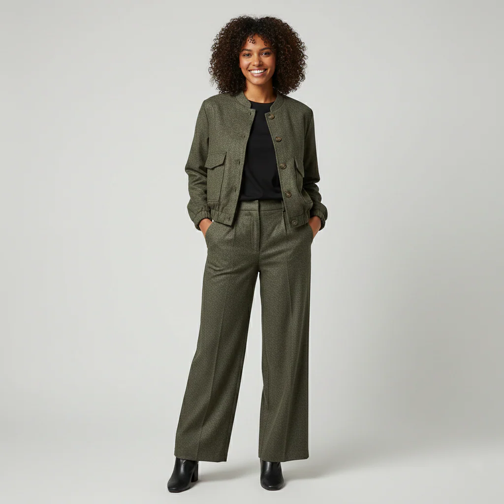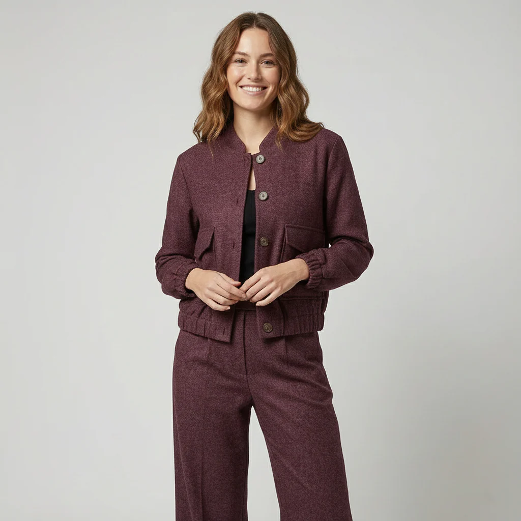Giacca crop modello bomber in tessuto puntinato misto viscosa. Collo pistagna, chiusura centrale con maxi bottoni, tasche quadrate con pattina frontali, fondo con elastico. Maniche ampie, polsini elasticizzati. Capo foderato. Vestibilità comoda. Composizione tessuto 65% poliestere 33% viscosa 2% elastan. Abbina il pantalone palazzo in tinta.