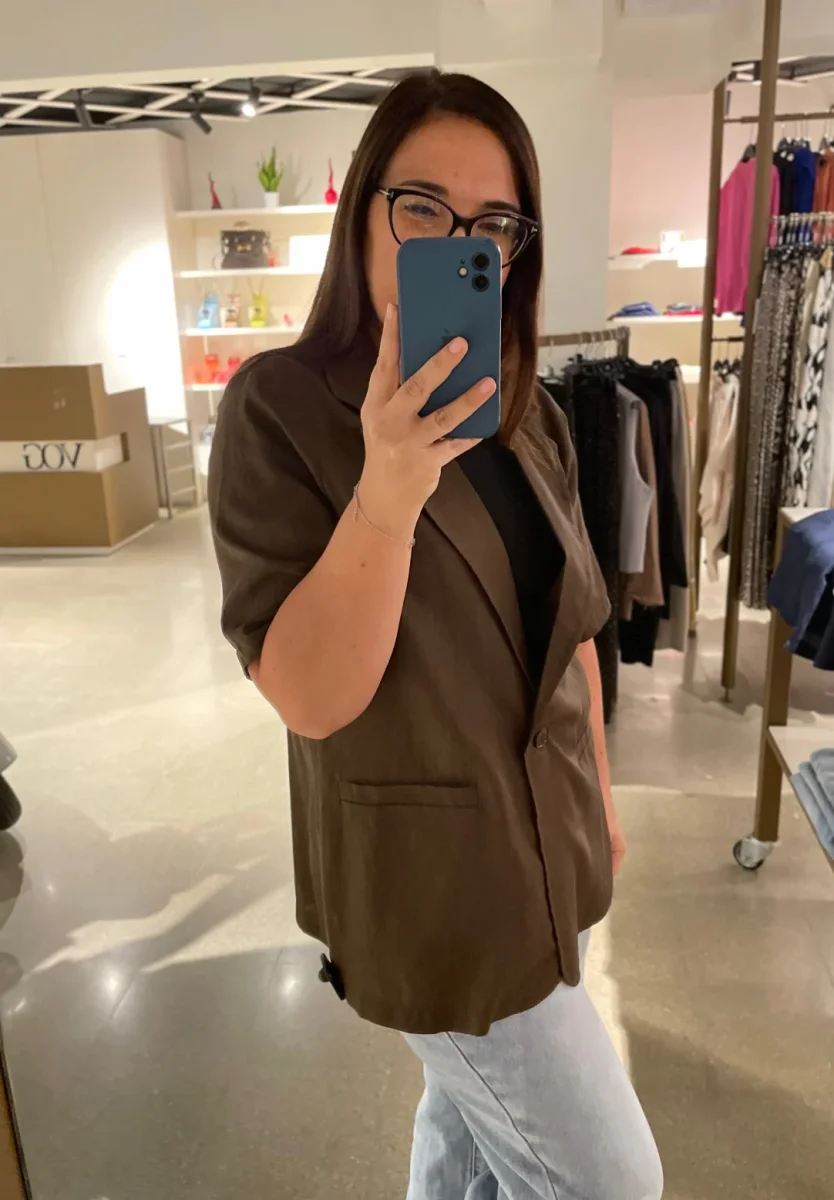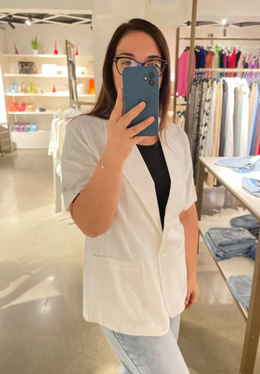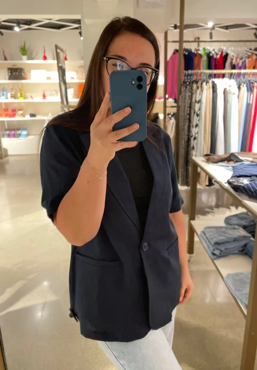 Giacca corta leggera in tessuto misto lino. Collo con revers modello camicia, chiusura con bottone in tinta, finte tasche a filetto laterali. Vestibilità regolare. Composizione tessuto 55% lino 45% viscosa. Crea il completo con il pantalone abbinato (opzione disponibile solo per alcuni colori.)