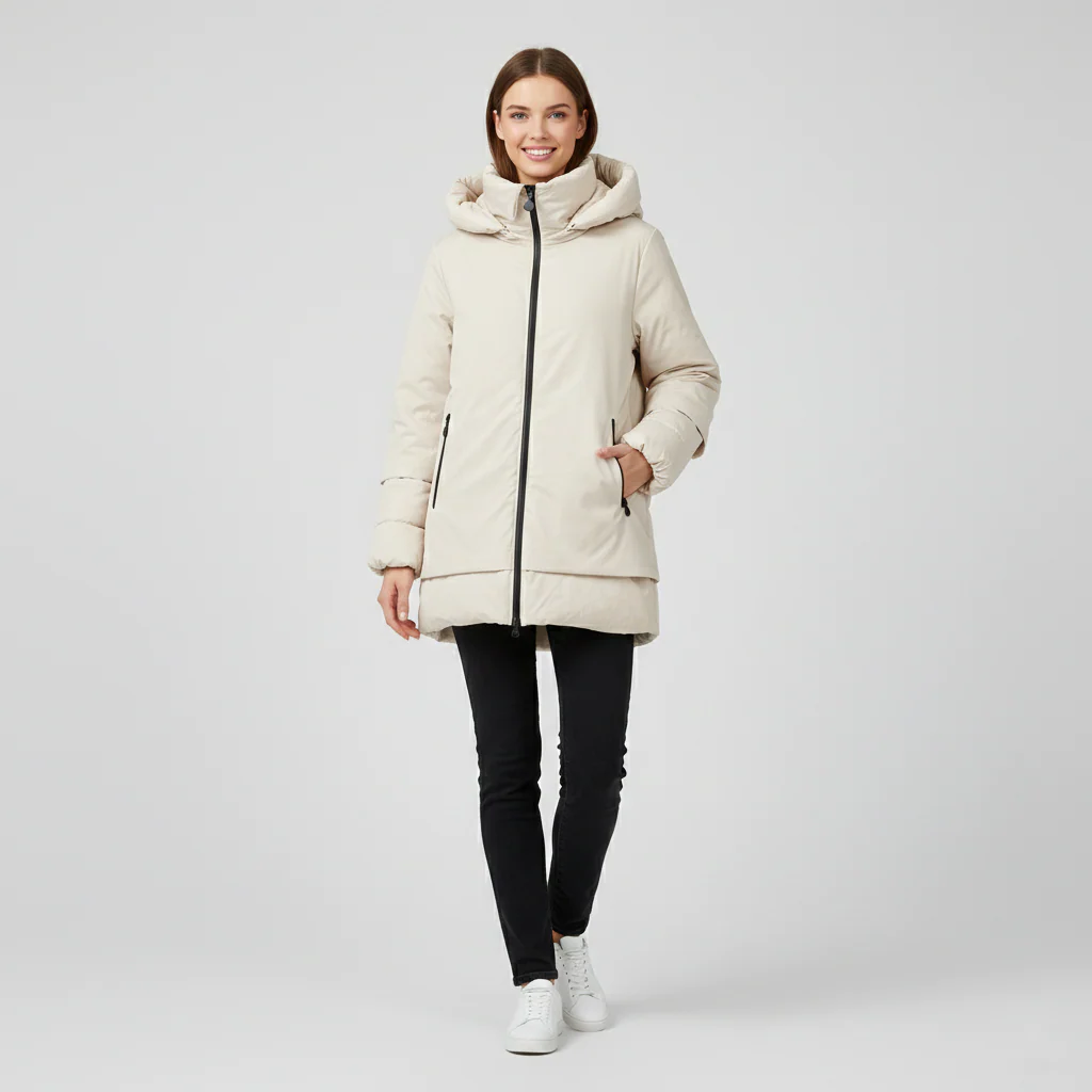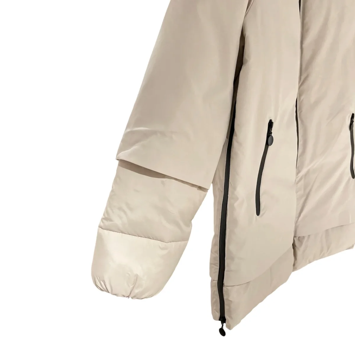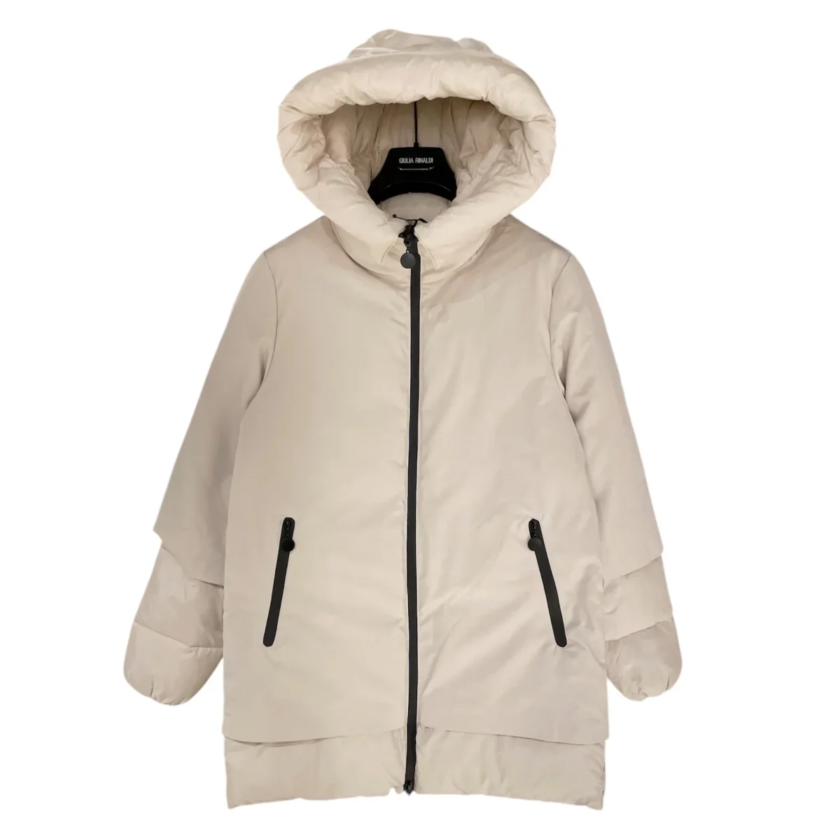 Giubbino midi donna doppio tessuto. Ampio cappuccio, chiusura con zip centrale gommata e tasche laterali chiuse da zip. Tessuto superiore liscio, maniche e fondo in tessuto lavorato matelassé tipo del piumino. Vestibilità regolare.
