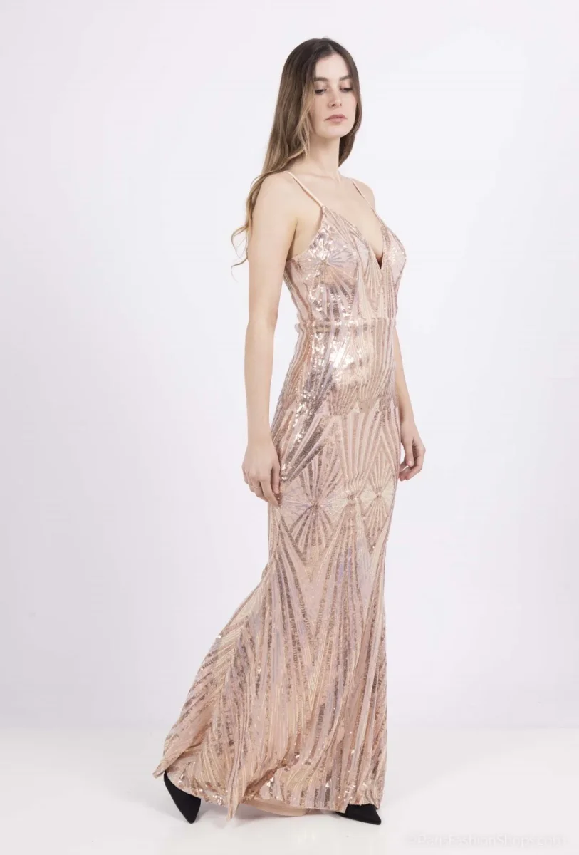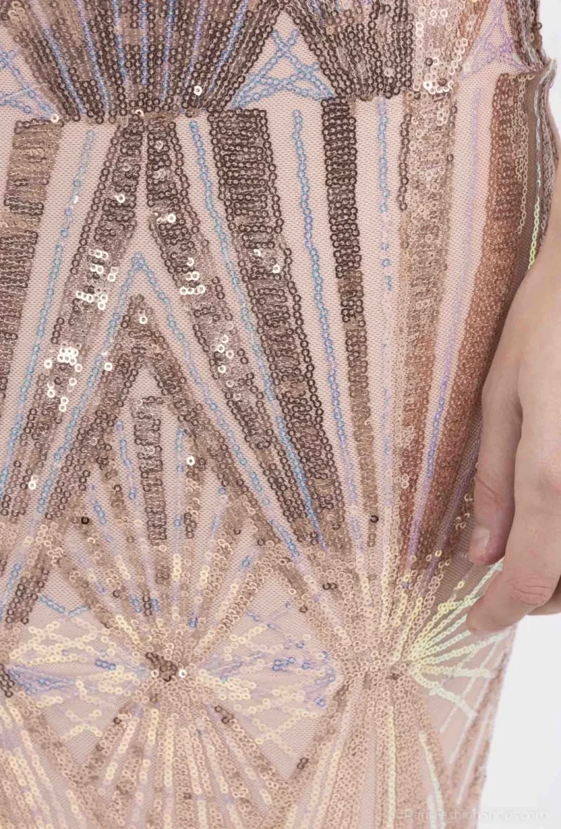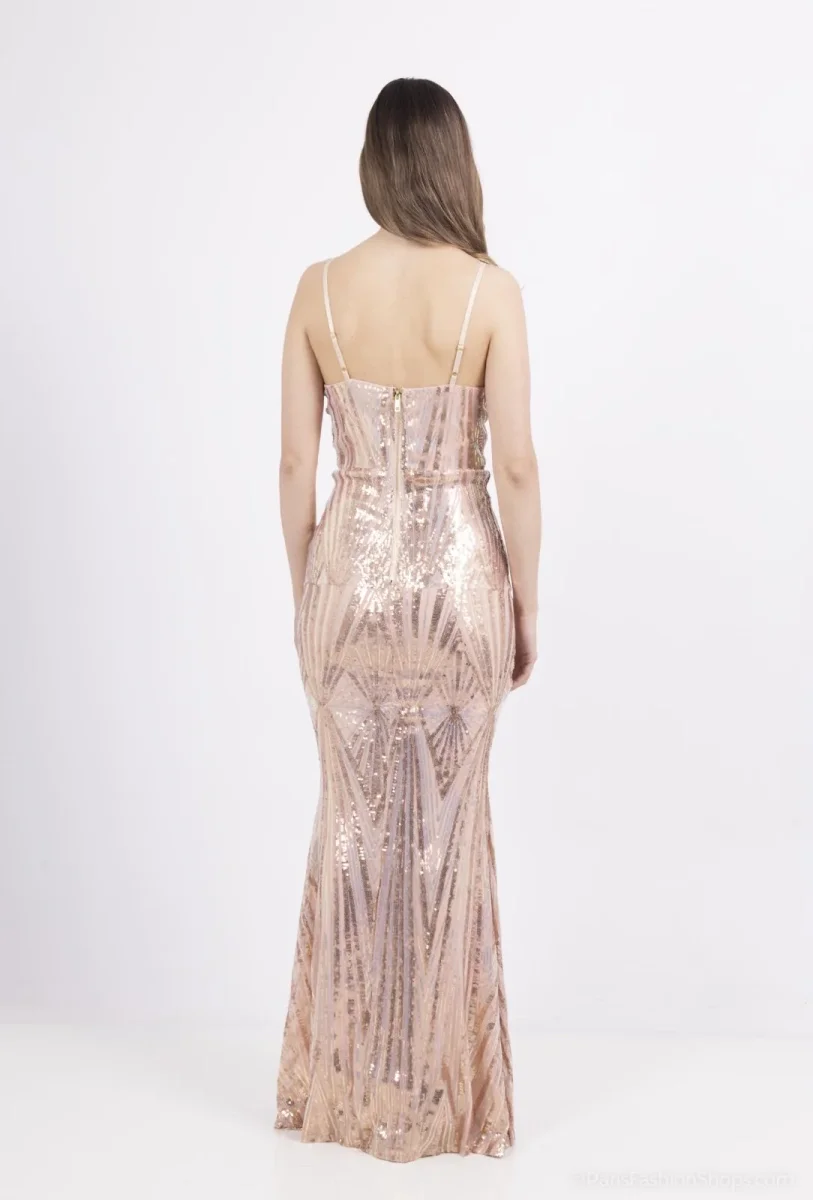 Vestito lungo modello sirena. Bretelle elasticizzate regolabili, chiusura con zip sulla schiena. Scollo a punta, vestibilità aderente. Tessuto interno elasticizzato, esterno interamente rivestito con paillettes multicolor cangianti.