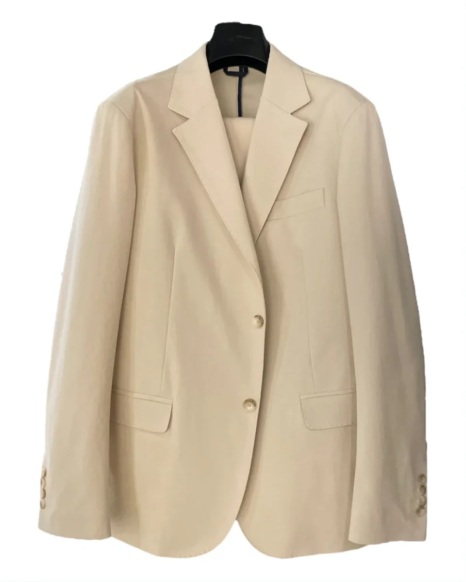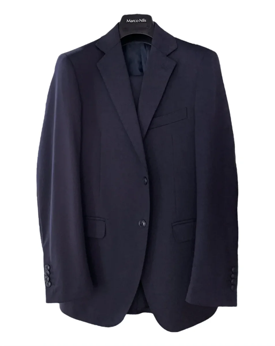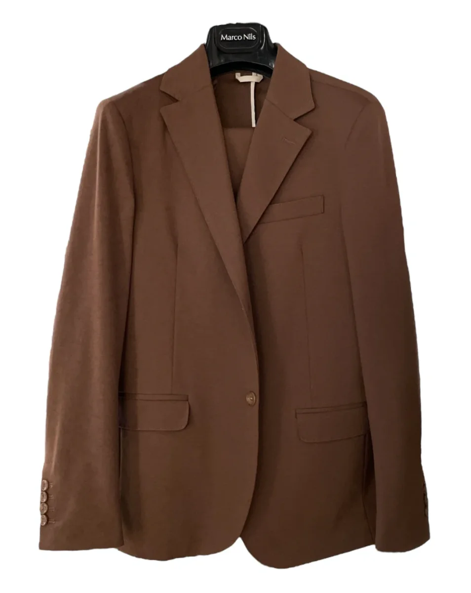 Abito in tessuto misto cotone elasticizzato. Collo con revers regolari, chiusura monopetto con bottoni in tinta, tasche con pattina applicata. Capo foderato. Pantalone vita regolare, cinturino fisso con passanti, chiusura con zip, pattina con bottone e gancio interno. Tasche a filo laterali e taschini posteriori con bottone. Gamba e fondo slim, piega non rifinita. Composizione tessuto 53% cotone 38% nylon 9% elastan.