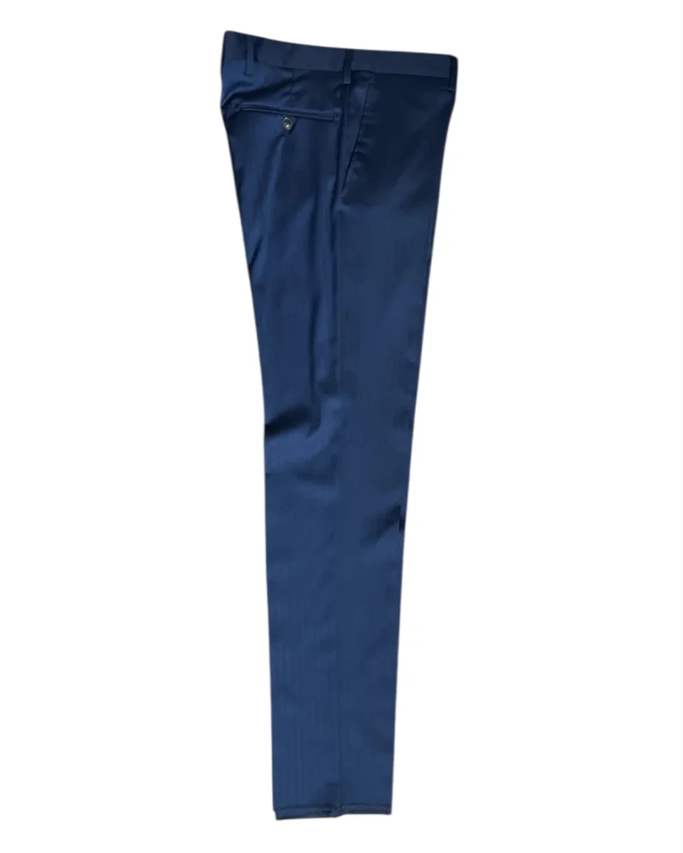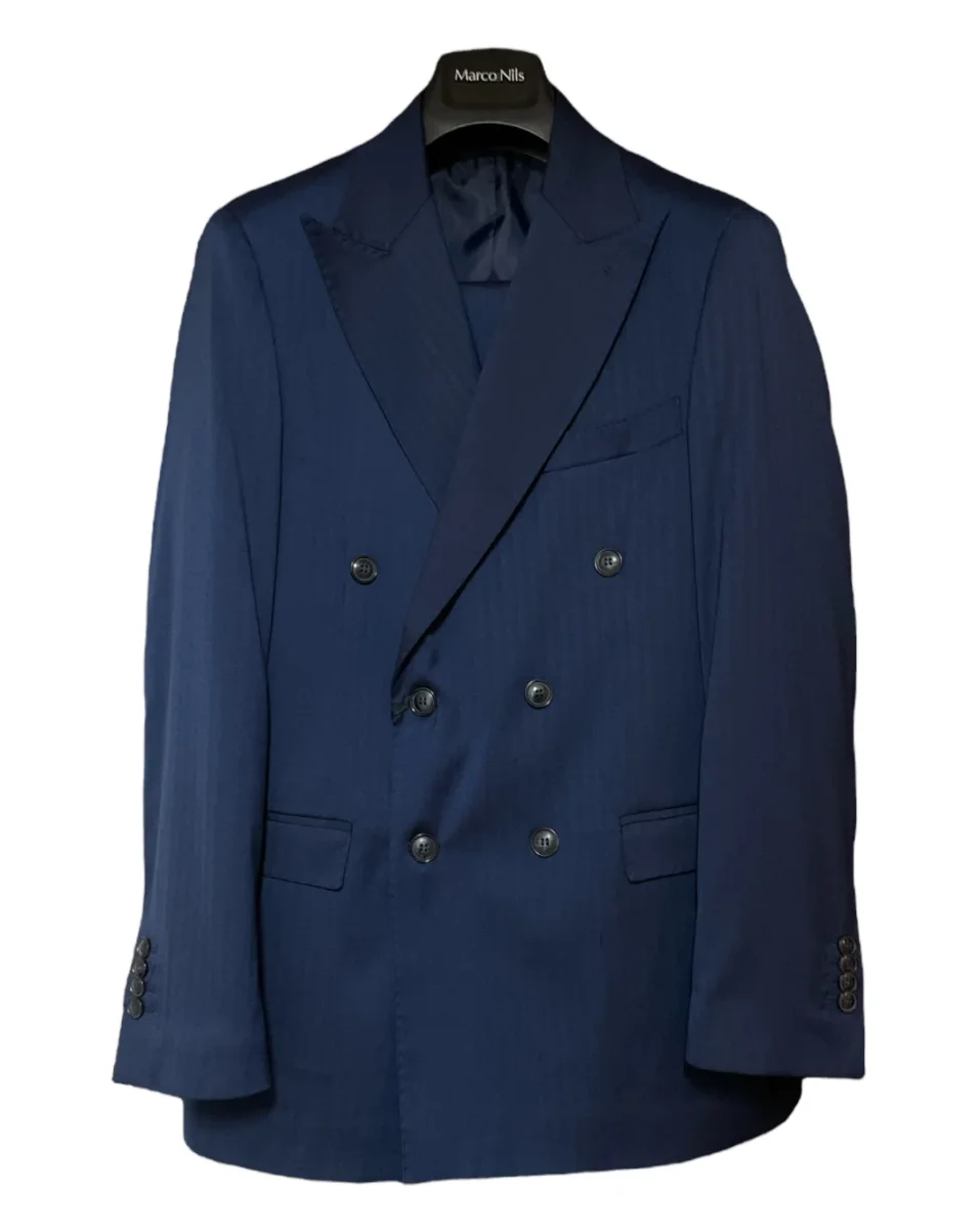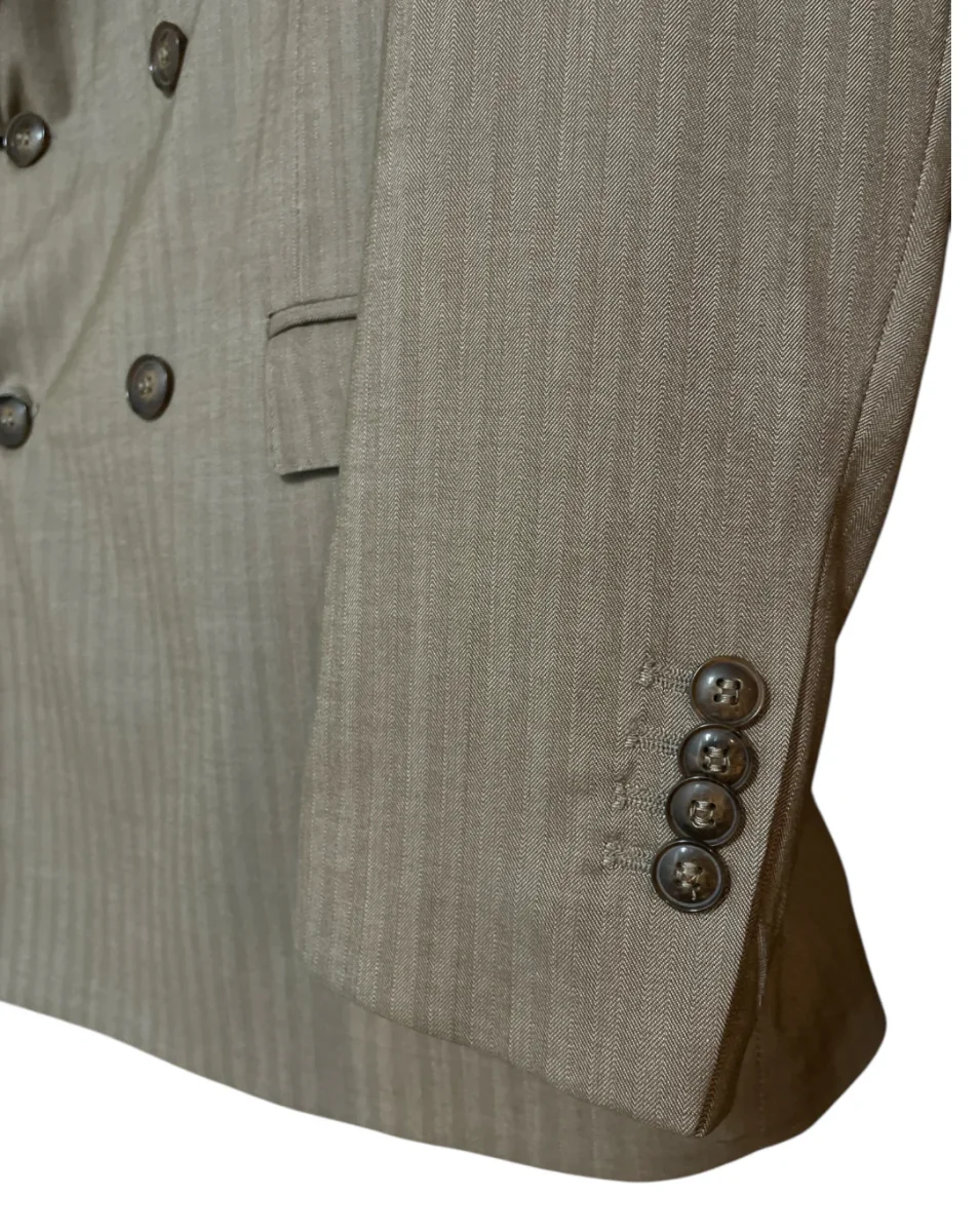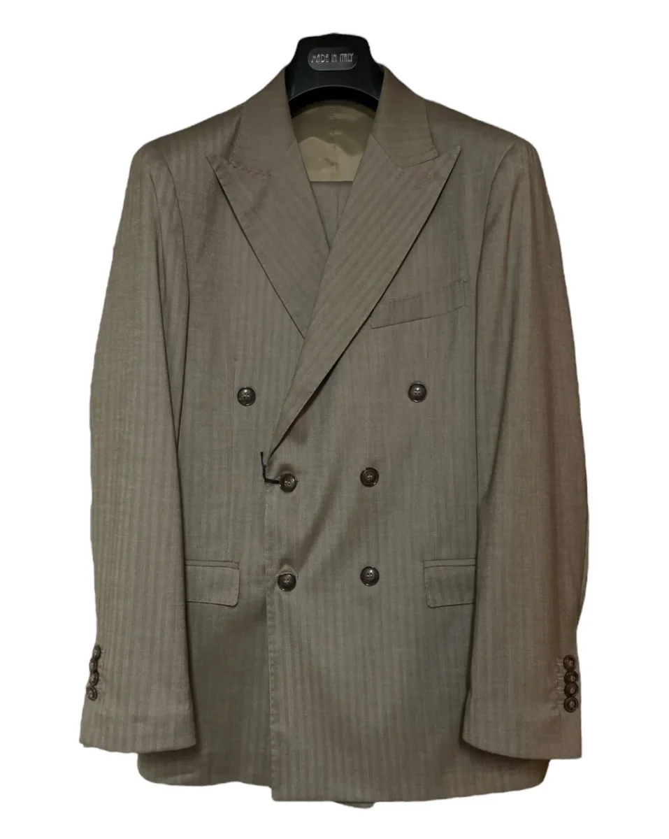 Abito in tessuto poliviscosa motivo righe tono su tono microfantasia spina di pesce. Collo con revers regolari, chiusura doppio petto con bottoni in tinta. Capo foderato. Pantalone vita regolare, cinturino fisso con passanti, chiusura con zip, pattina con bottone e gancio interno. Tasche a filo laterali e taschini posteriori con bottone. Gamba e fondo slim, piega non rifinita. Composizione tessuto 83% poliestere 15% viscosa 2% elastan, fodera 100% poliestere.
