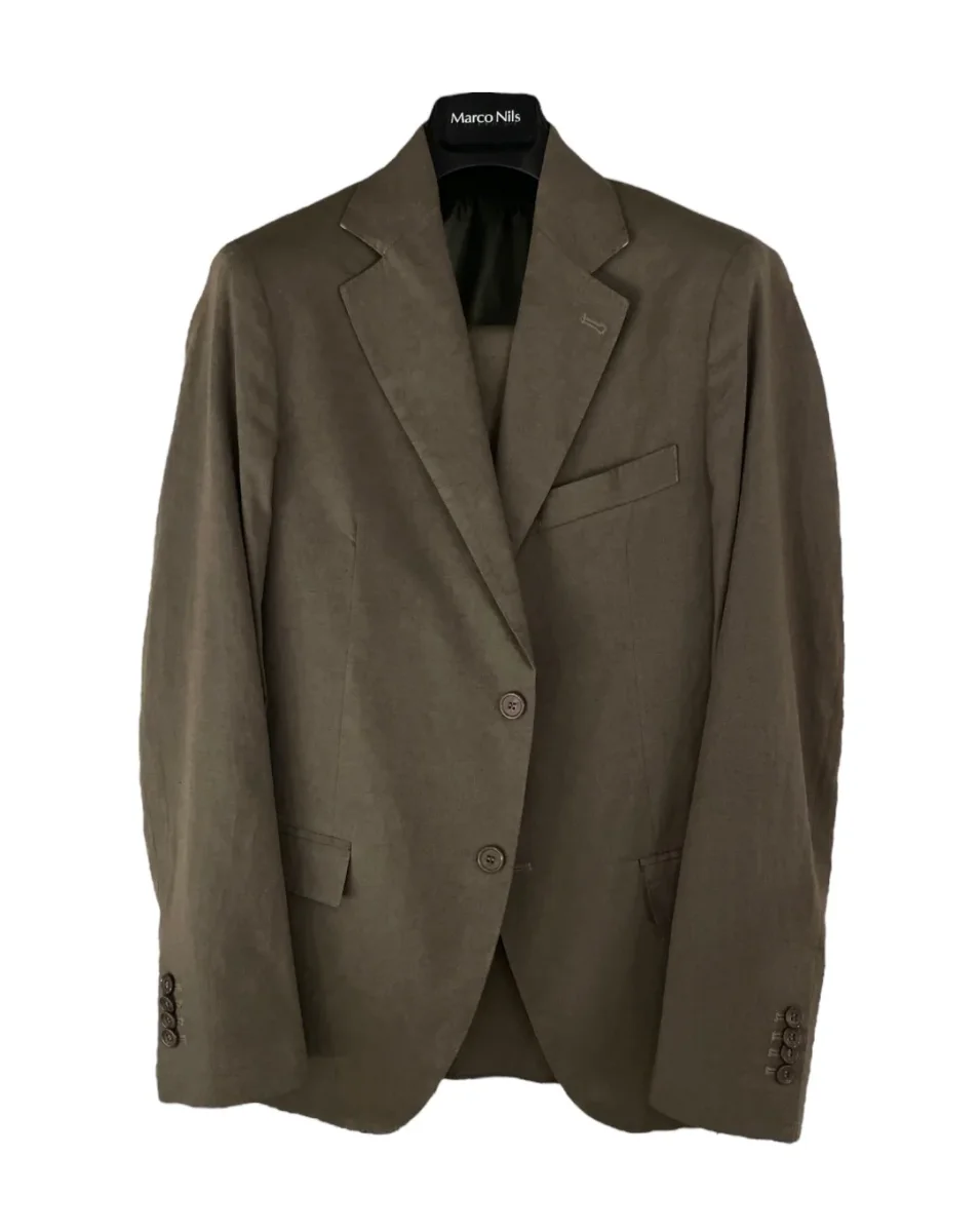 Abito estivo in tessuto 100% lino. Giacca con revers regolare, taschino sul petto, chiusura con bottoni in tinta, tasche laterali con pattina applicata. Capo non foderato. Pantaloni vita regolare, tasche a filo laterali, tasche a filetto posteriori. Gamba e fondo dritti, piega non rifinita. Vestibilità regolare. Drop 7.