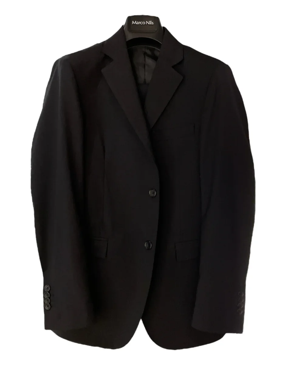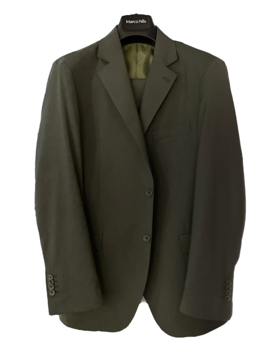 Abito in tessuto leggero misto viscosa. Collo con revers regolari, chiusura monopetto con bottoni in tinta, tasche con pattina applicata. Capo foderato. Pantalone vita regolare, cinturino fisso con passanti, chiusura con zip, pattina con bottone e gancio interno. Tasche a filo laterali e taschini posteriori con bottone. Gamba e fondo slim, piega non rifinita. Composizione tessuto 69% poliestere 29% viscosa 2% elastan.