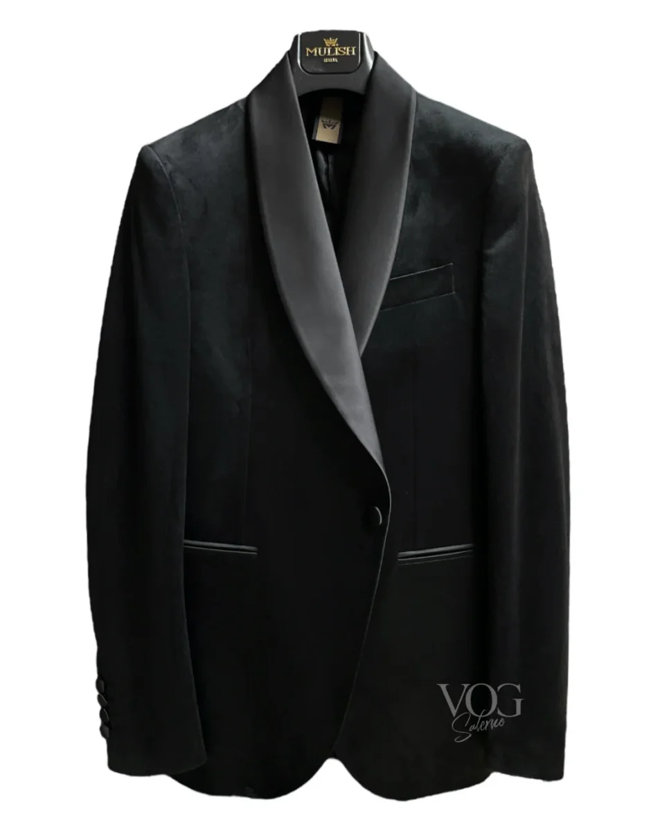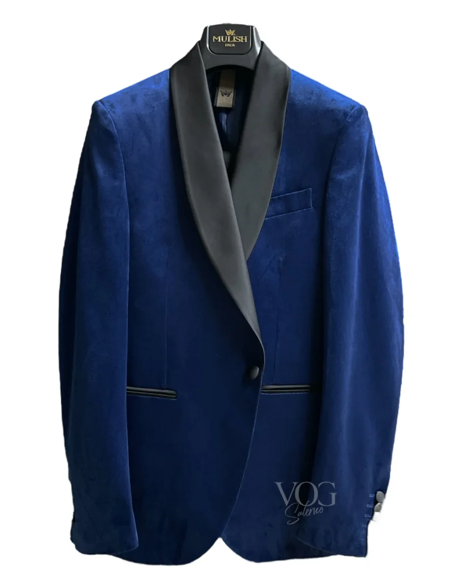 Abito da cerimonia modello smoking doppio tessuto. Giacca slim fit in tessuto velluto liscio con collo scialle in tessuto lucido, chiusura con un bottone rivestito in tessuto, tasche a filetto laterali con bordo in tessuto rasato lucido. Tessuto tecnico. Pantaloni slim fit in tessuto tecnico semi lucido, vita alta con chiusura con gancio interno e bottone e zip. Tasche posteriori a filetto in tessuto lucido. Vestibilità slim. Composizione tessuto giacca 100% poliestere, composizione tessuto pantalone 62% poliestere 35% viscosa 3% elastan.
