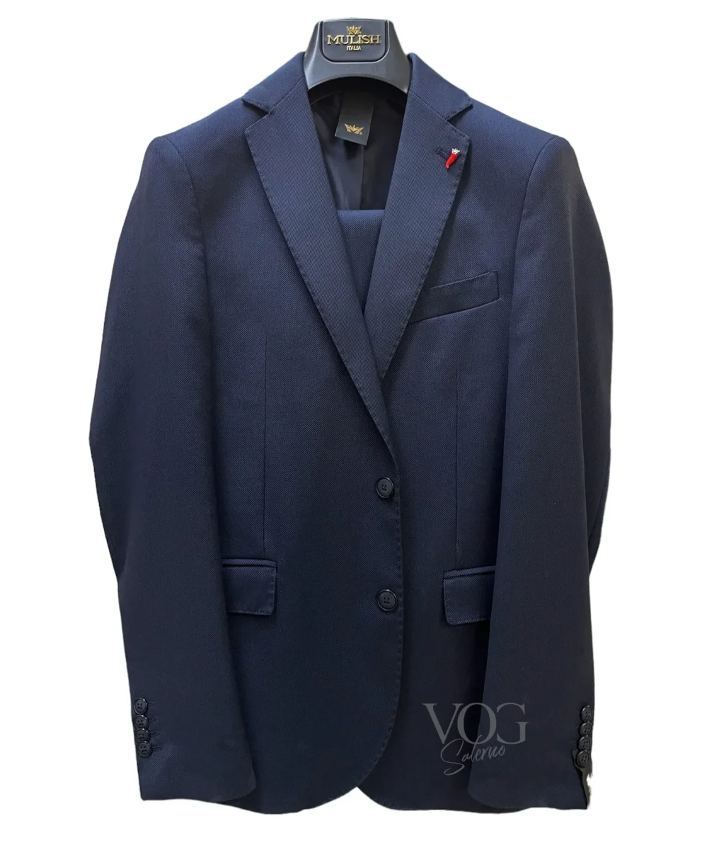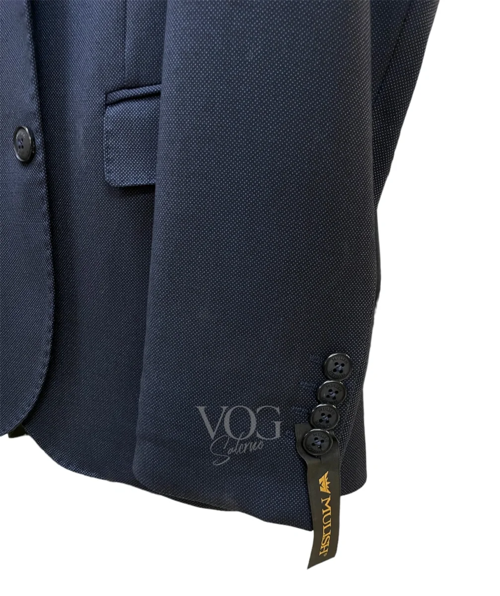 Abito slim fit in tessuto elasticizzato misto viscosa. Giacca con collo con revers regolari, chiusura a due bottoni, tasche laterali con pattina applicata e taschino sul petto. Pantalone vita regolare con passanti, chiusura con zip e gancio interno, gamba slim e fondo stretto con piega liscia. Tessuto lavorato trama occhio di pernice. Vestibilit slim. Composizione tessuto 80% poliestere, 18% viscosa, 2% elastan.