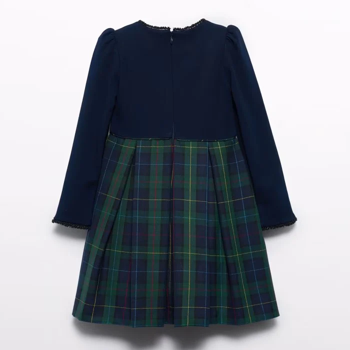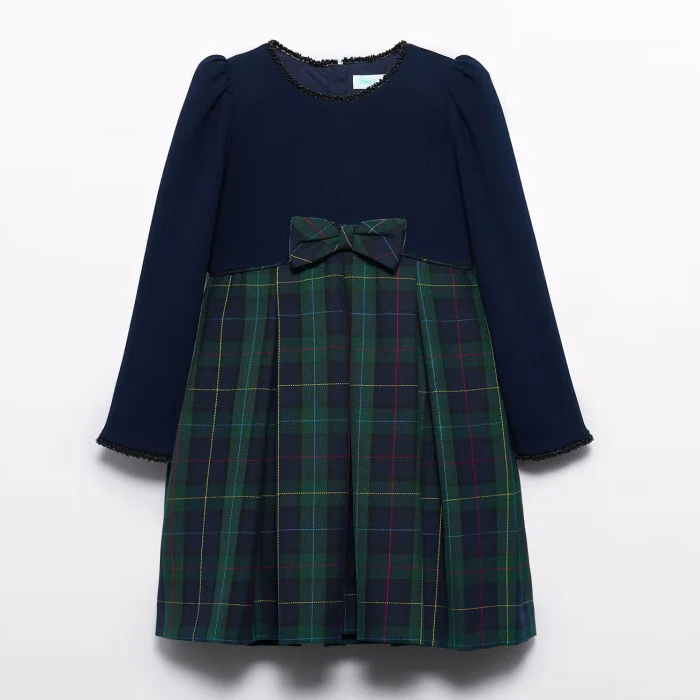 Abito ABEL&LULA in tessuto a fantasia quadri nella parte inferiore, fiocco applicato, perline applicate ai polsini e al girocollo, chiusura con zip sul retro, fodera interna in cotone.