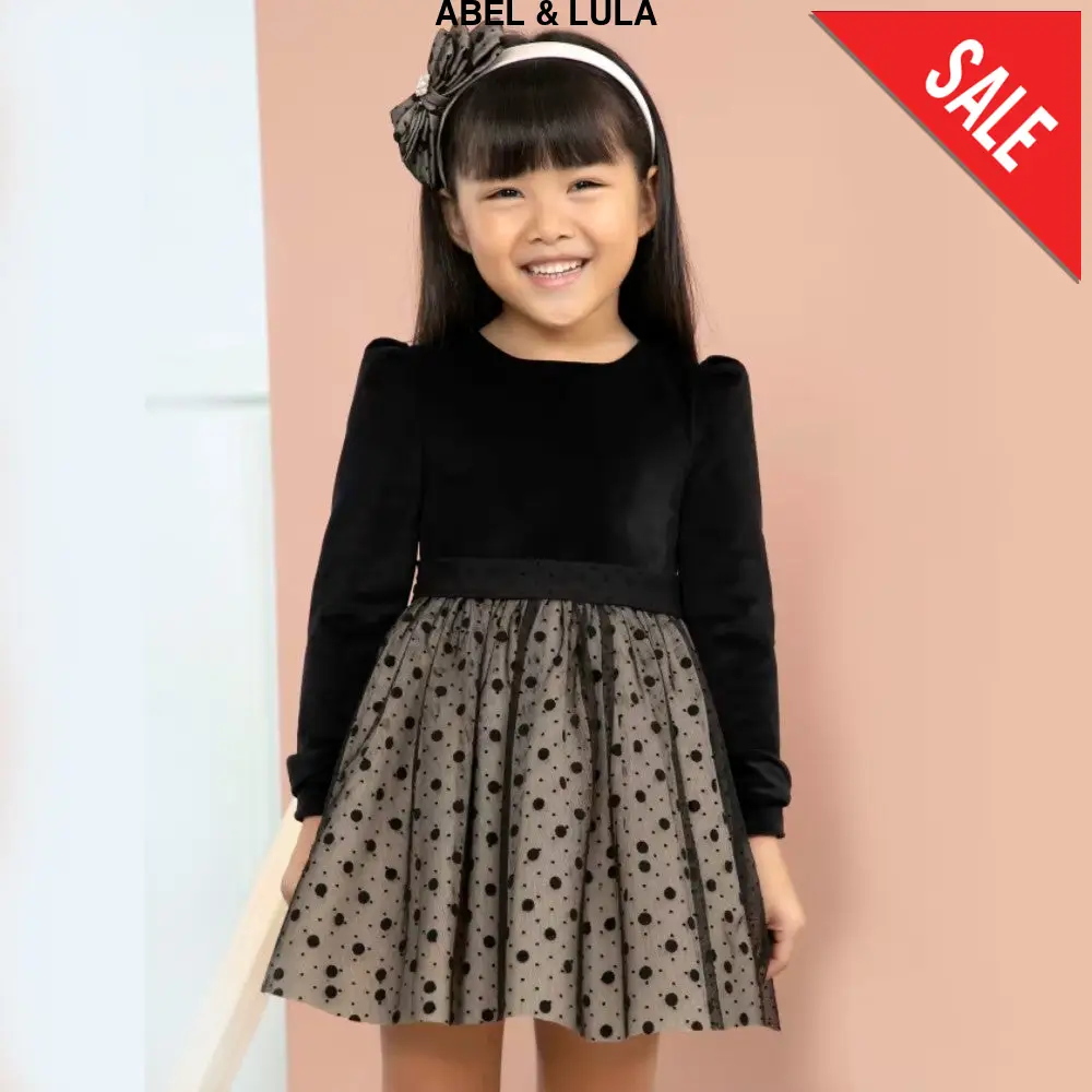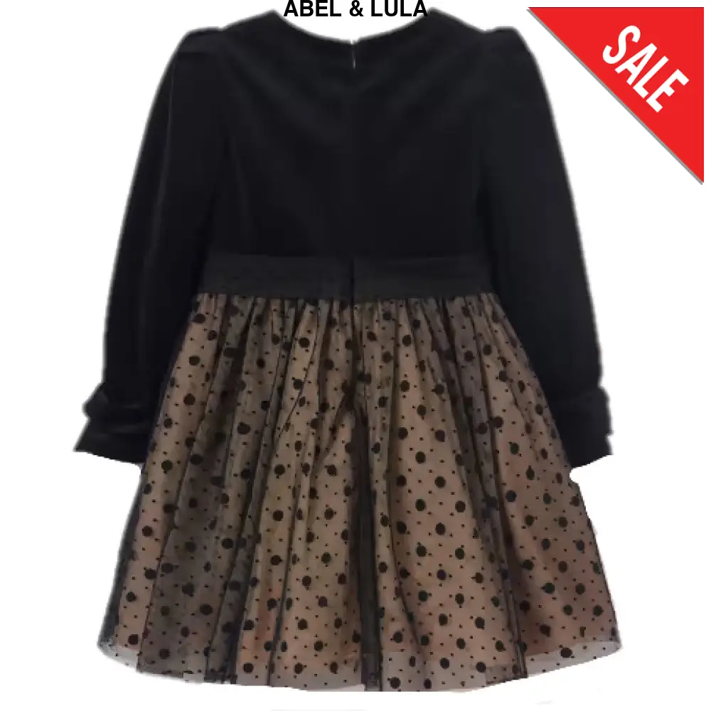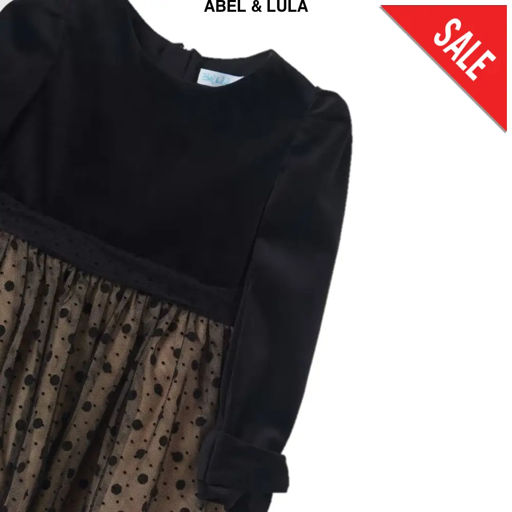 Abito ABEL&LULA con parte superiore in ciniglia e parte inferiore in tulle fantasia pois foderato in cotone chiusura con zip a scomparsa sul retro.