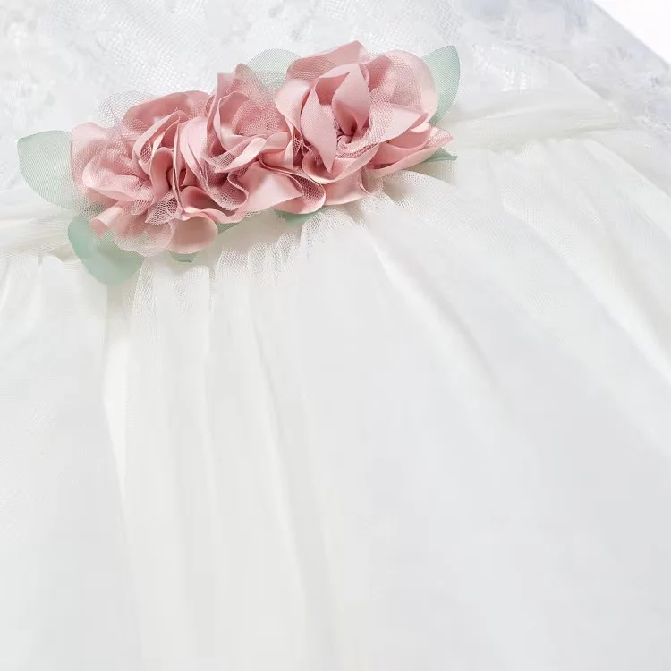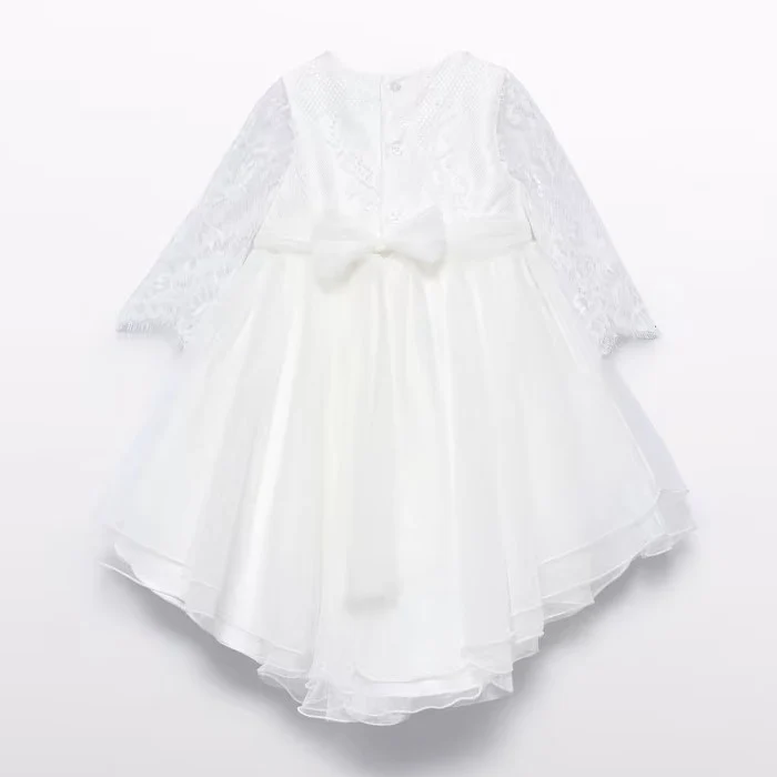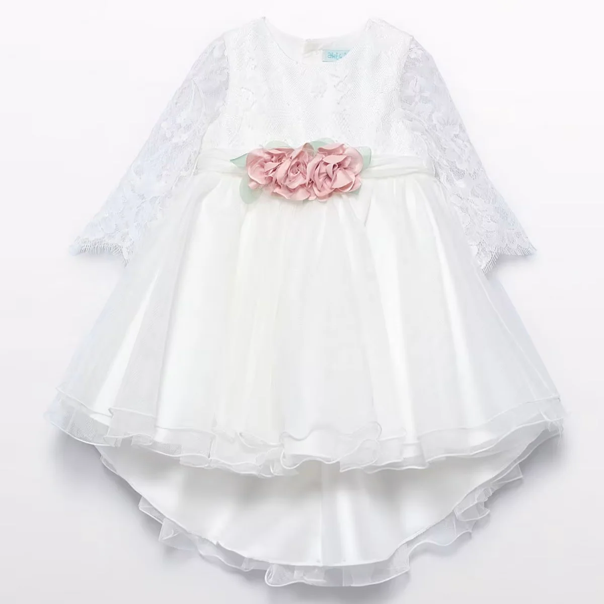 Abito ABEL&LULA, modello asimmetrico, con parte superiore in pizzo lavorato, parte inferiore in tulle multi balze, chiusura con bottoncini sul retro, cintura in tulle in vita con applicazioni in colori a contrasto e fiocco sul retro con chiusura clips, fodera interna in cotone.