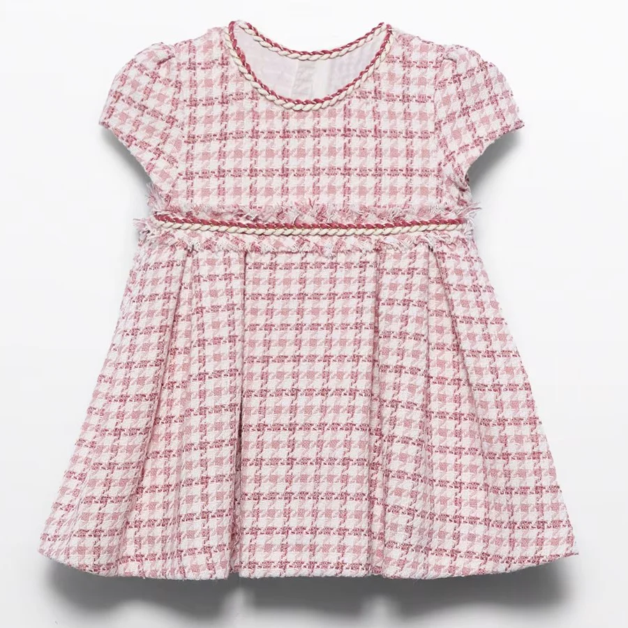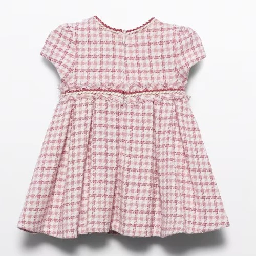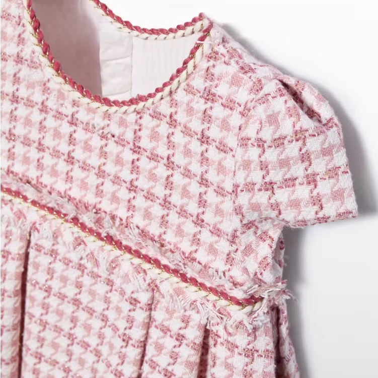 Abito ABEL&LULA in misto lana a fantasia pied de poule laminata, treccina applicata in vita e al girocollo, fodera interna in cotone, chiusura con zip sul retro.