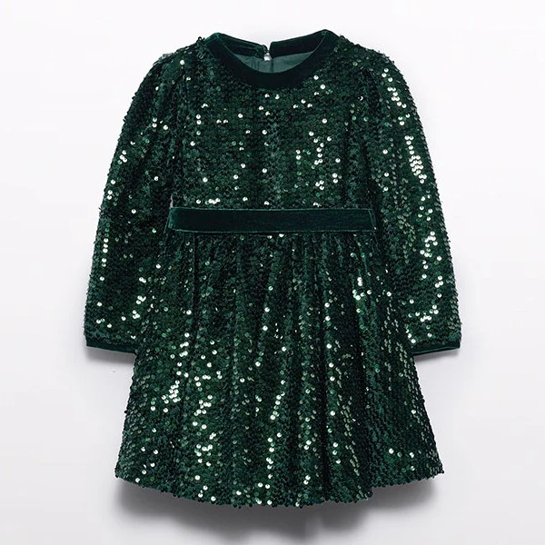 Abito ABEL&LULA in tessuto con paillettes applicate, girocollo e polsini in velluto, chiusura con zip e bottoncino sul retro, fodera interna in cotone, in vita cintura in velluto con chiusura clips sul retro.