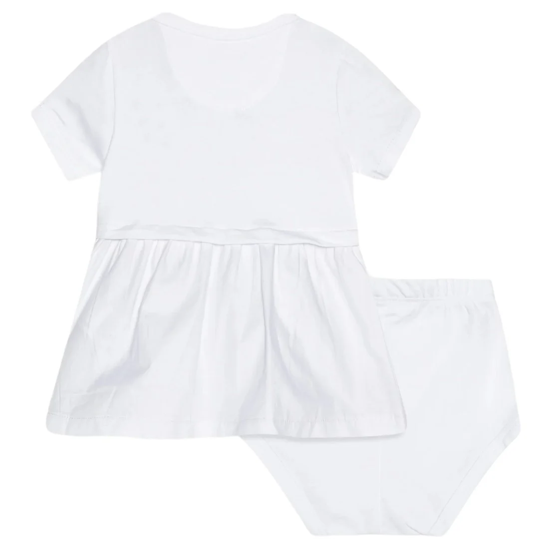 Abito CALVIN KLEIN in cotone con elastico in vita, logo stampato a rilievo, chiusura con clips su spalla, in coordinato coulotte copri pannolino con elastico in vita e logo stampato a rilievo.