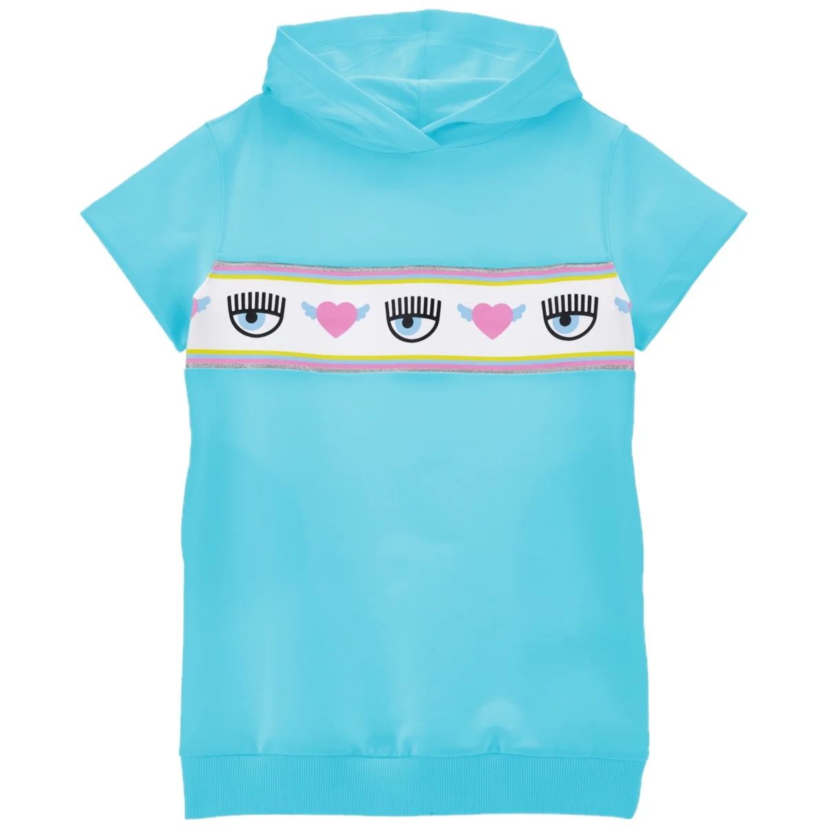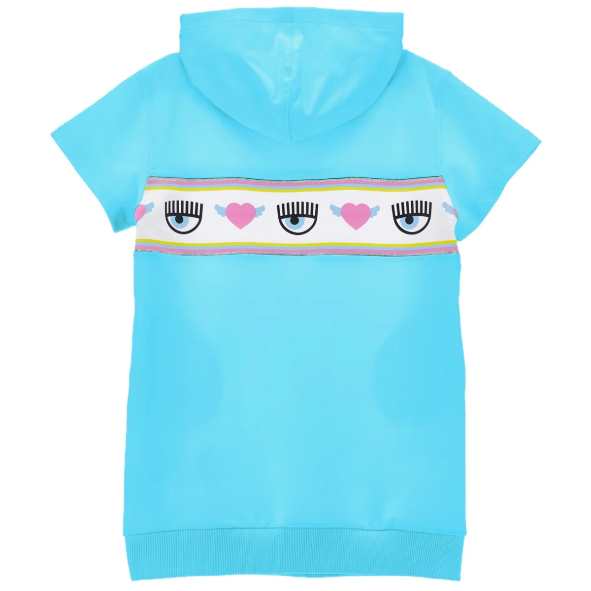 Abito CHIARA FERRAGNI in cotone con interno garzato, maxi logo stampato in colori a contrasto, bande glitterate, cappuccio applicato.