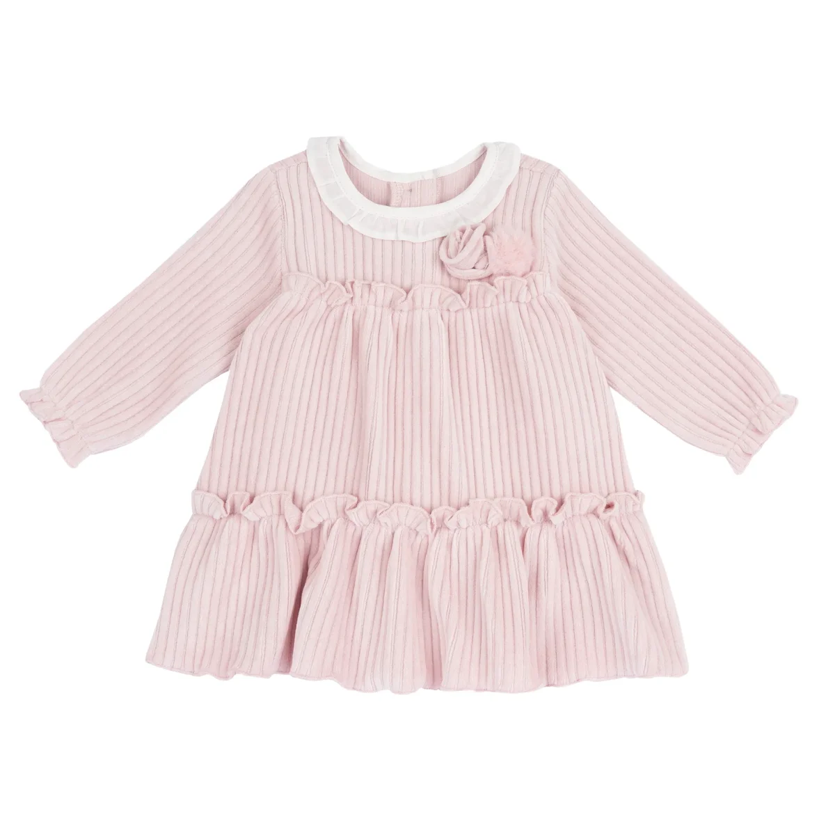 Abito CHICCO in ciniglia a costine con colletto applicato in tessuto e colore a contrasto, rosa e pom pon in ecopelliccia applicato, inserti elastici applicati, elastico ai polsini, chiusura con bottoncini a cuoricino sul retro.
