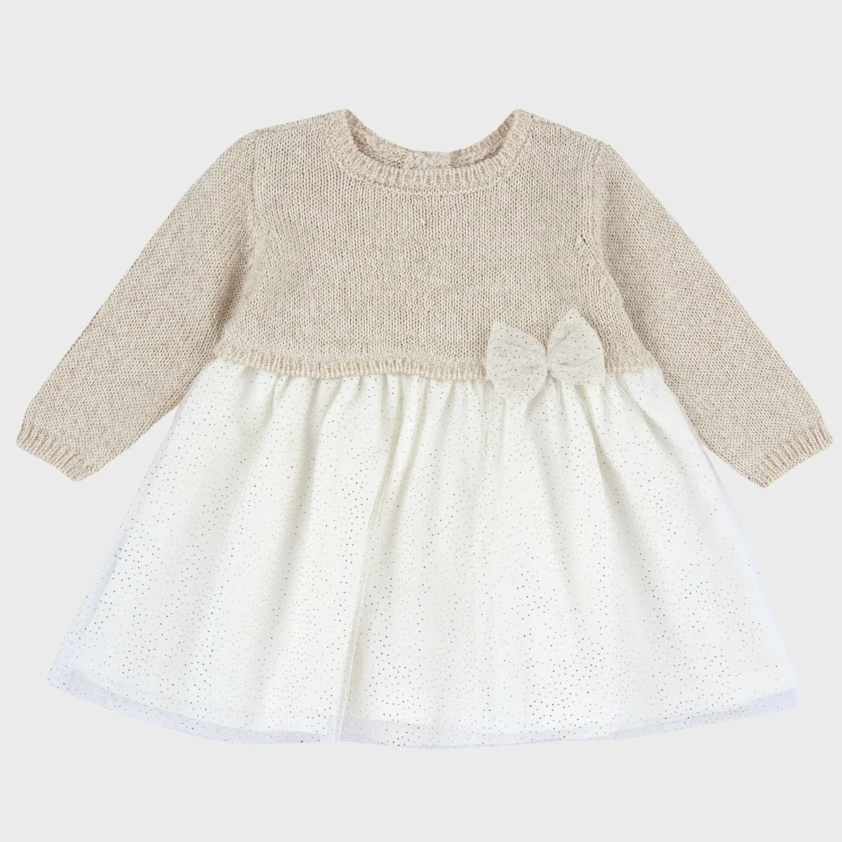 Abito CHICCO in caldo cotone con parte superiore in maglia laminata, gonna multi balze in tulle glitterato applicata, fiocchetto in tulle applicato, chiusura con bottoncini sul retro.