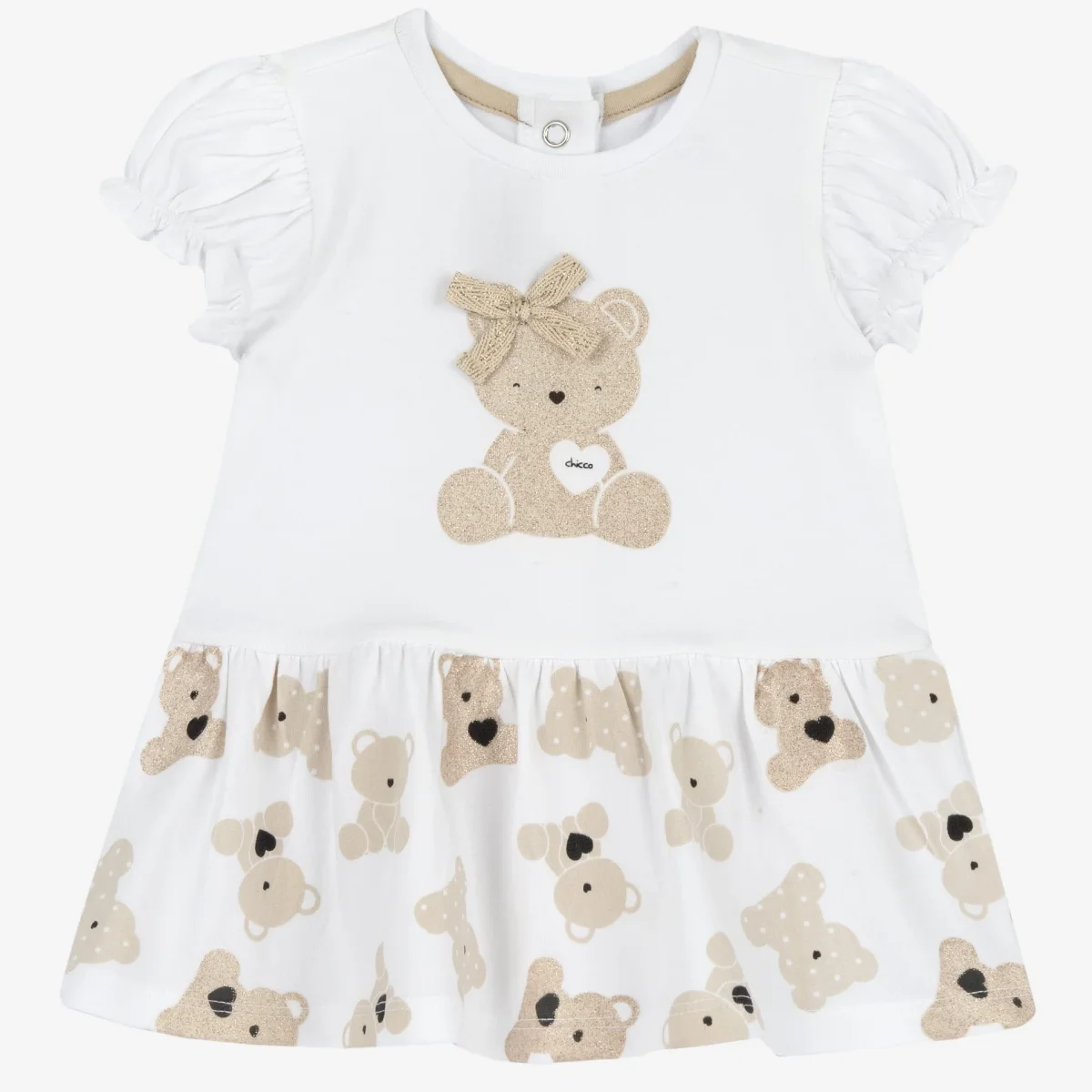 Abito CHICCO in cotone con stampa orsetto glitter e fiocchetto applicato, logo stampato in colore a contrasto, parte inferiore a fantasia orsetti stampata, elastico al giro manica, chiusura con clips sul retro.