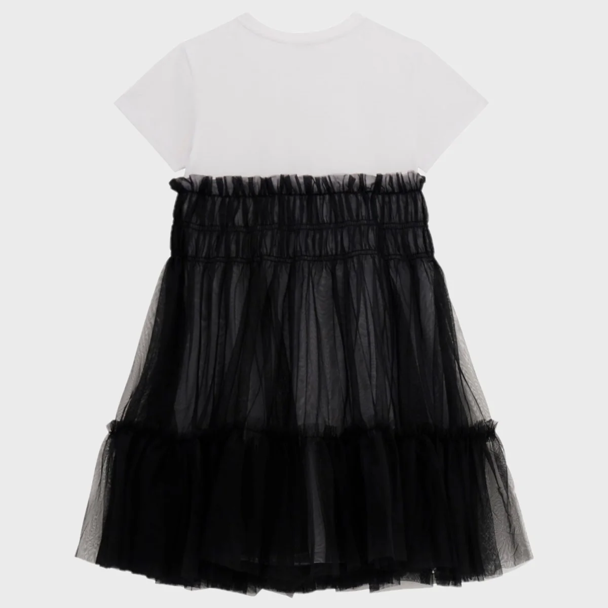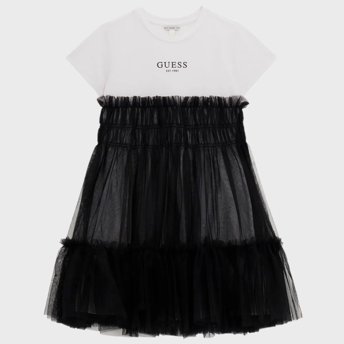 Abito GUESS in cotone, modello mezza manica girocollo, logo stampato applicato, gonna in tulle multivelo con elastici applicati.