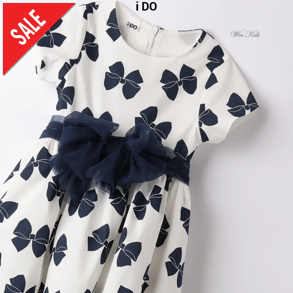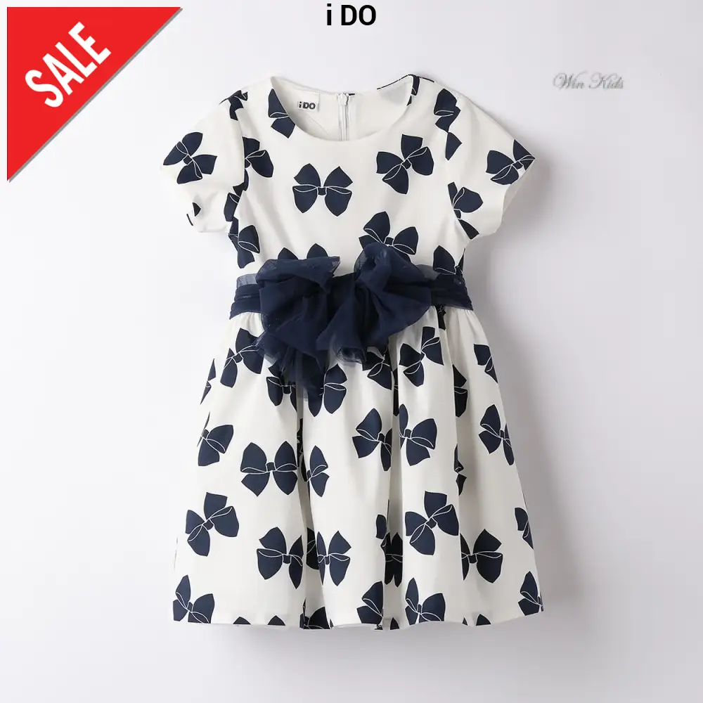Abito I DO a fantasia fiocchi in colore a contrasto, finta cintura con fiocco in tessuto e colore a contrasto, chiusura con zip sul retro, fodera interna in cotone con balza in tulle.