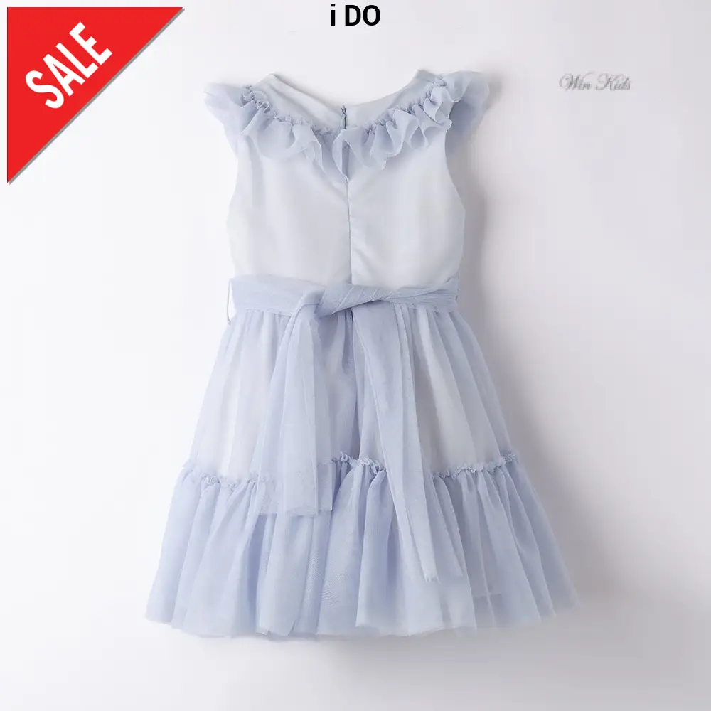 Abito I DO in tulle con voilant e balze applicate, cintura in tulle in vita, chiusura con zip sul retro, fodera interna in cotone.