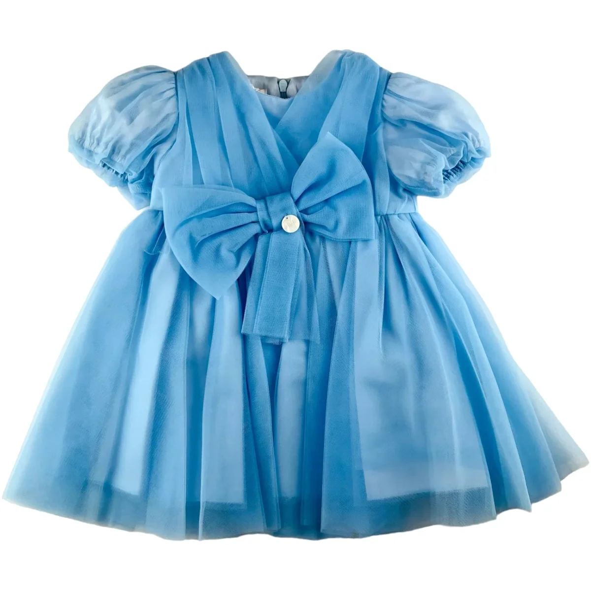 Abito LE BEBE’ in tulle, fiocco applicato con ciondolo le bebe’, sotto abito in cotone, apertura con zip a scomparsa sul retro.