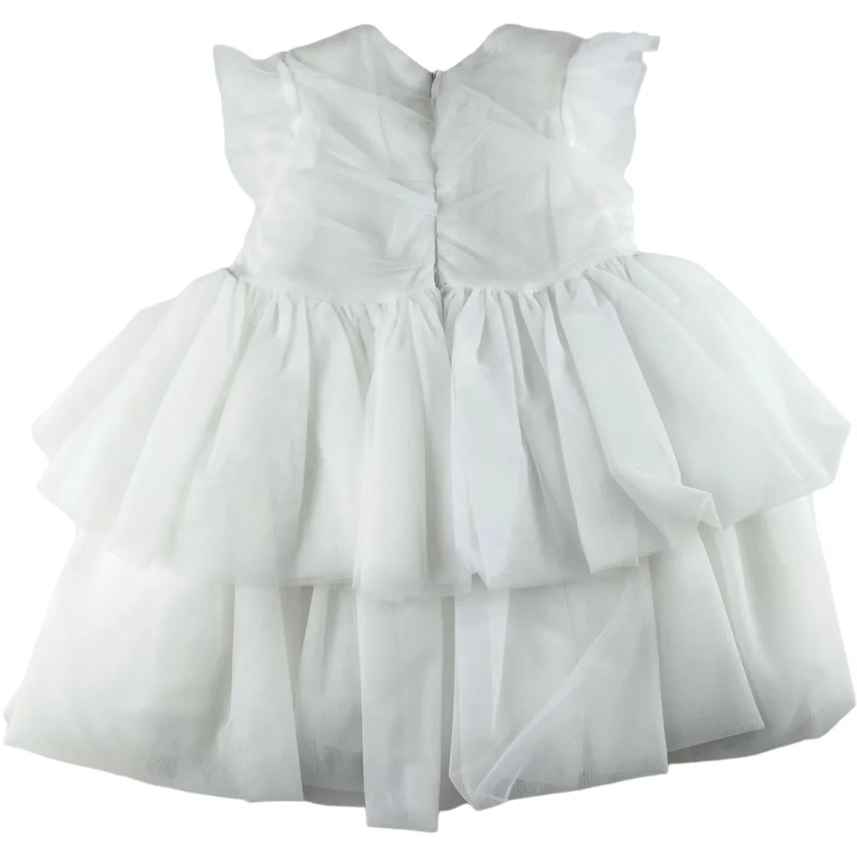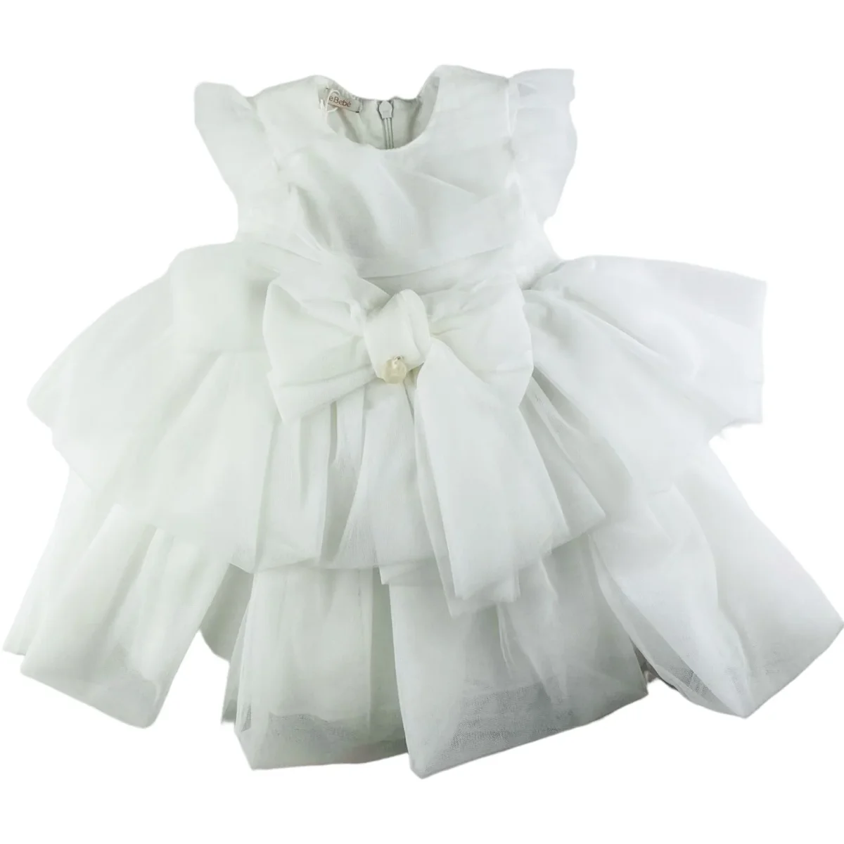 Abito LE BEBE’ in tulle, fiocco applicato con ciondolo le bebe’, sotto abito in cotone, apertura con zip a scomparsa sul retro.