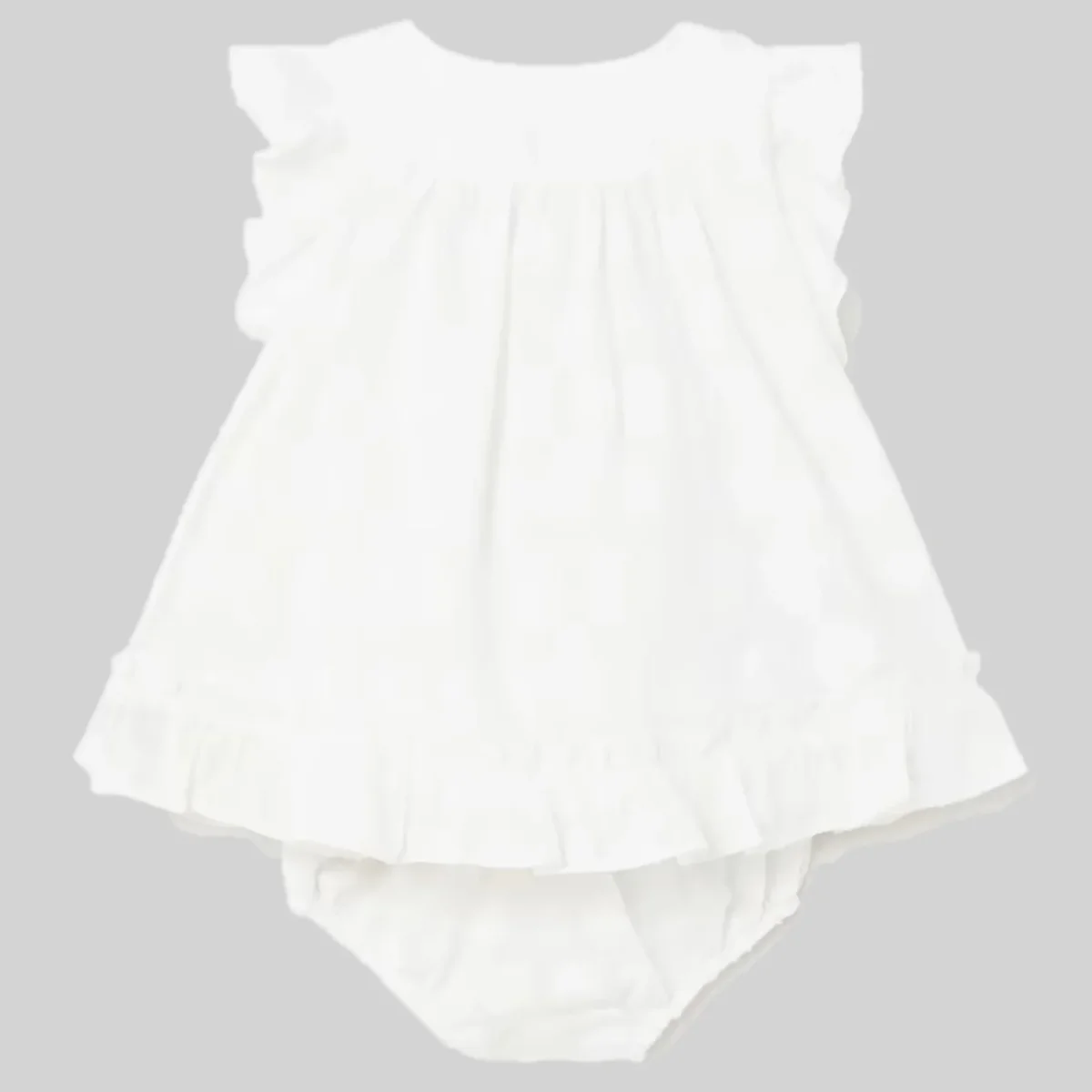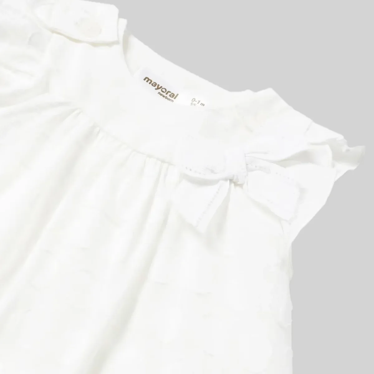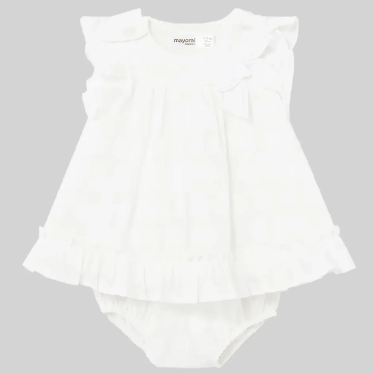 Abito MAYORAL in 100% cotone lavorato, sotto abito in cotone, fiocco applicato. Dotato di coulotte copri pannolino.