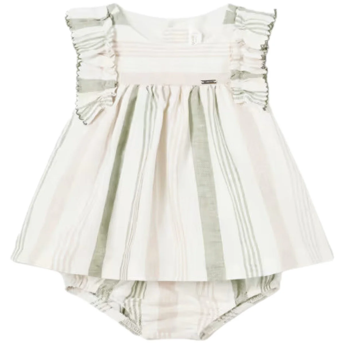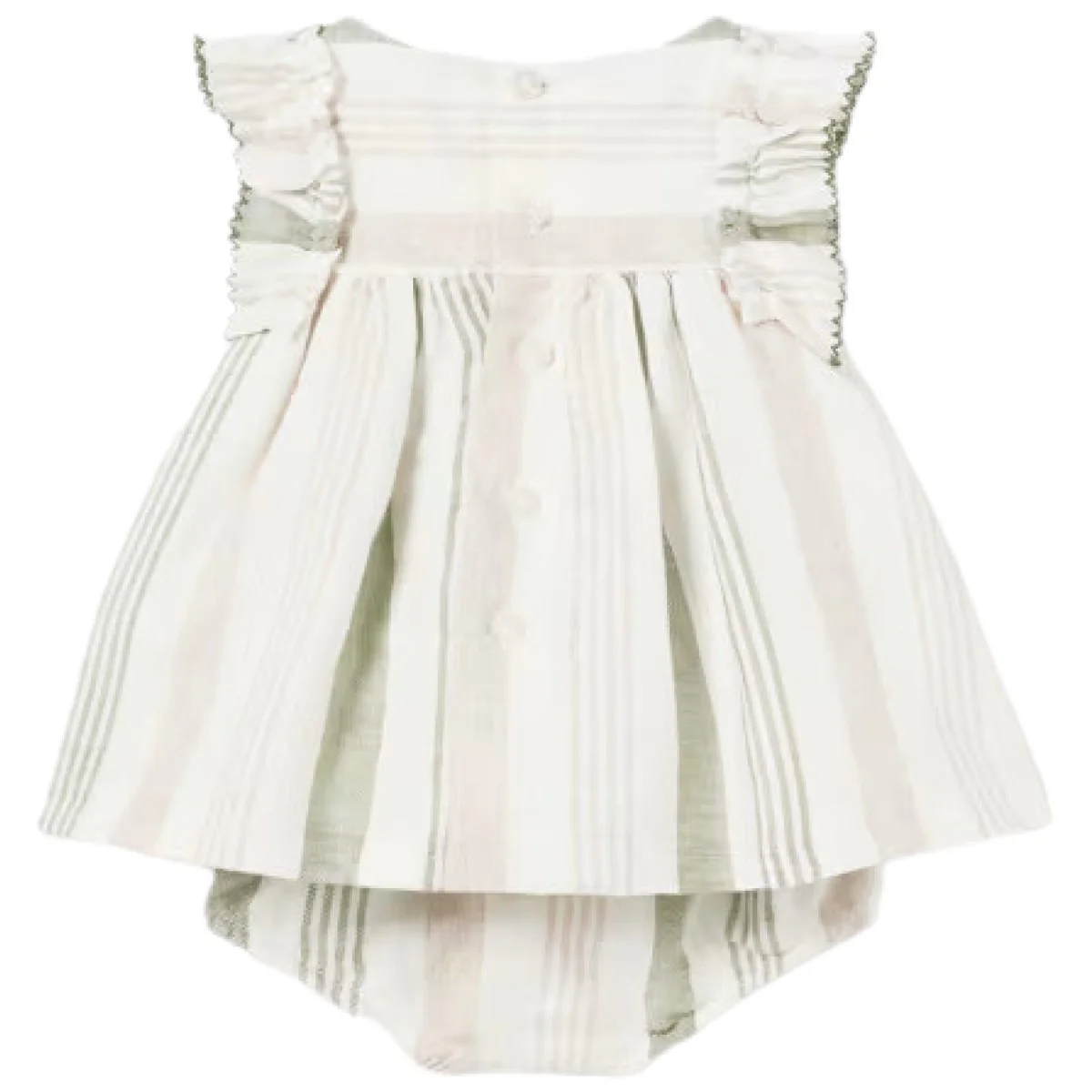 Abito MAYORAL in misto lino a fantasia rigata in colori a contrasto, voilant con bordo ricamato applicato al giromanica, chiusura con bottoncini logati sul retro, fodera interna in cotone, in coordinato coulotte copripannolino con elastico in vita e al giro gamba.