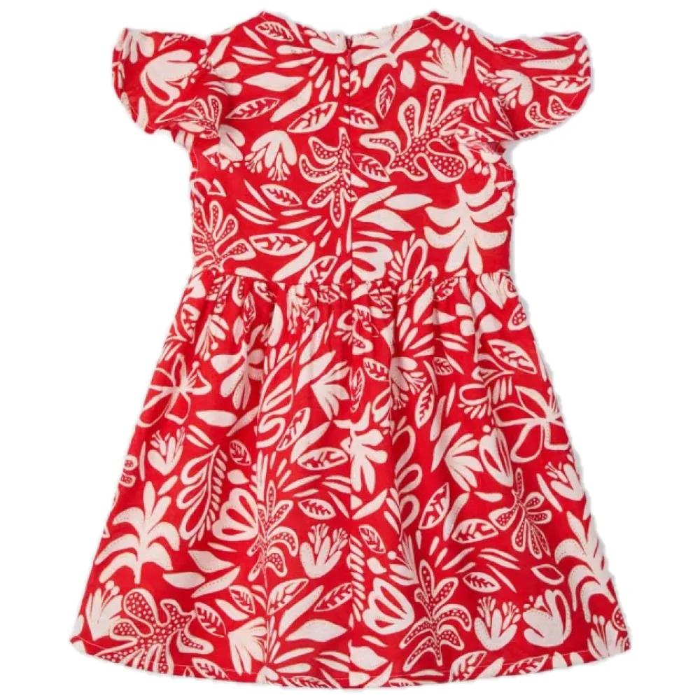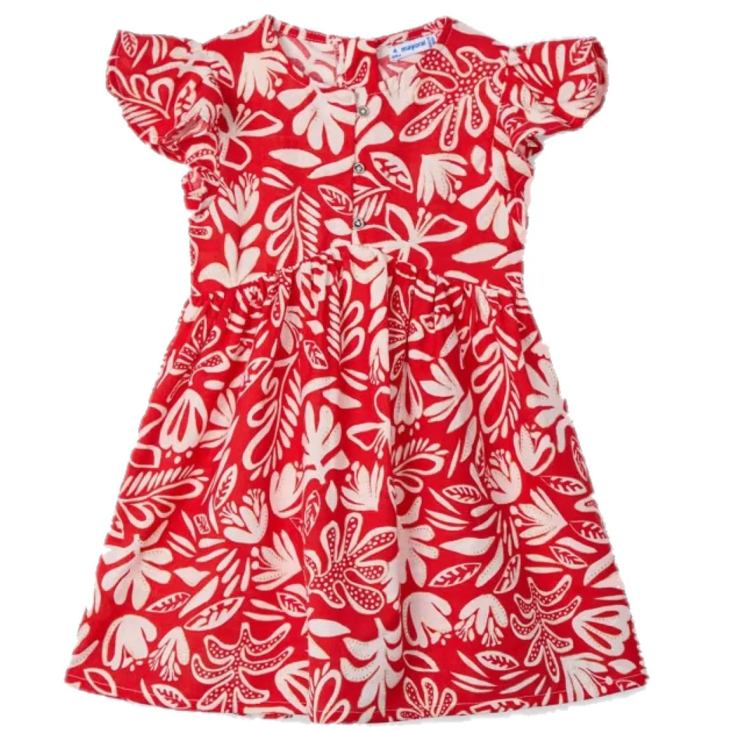 Abito MAYORAL in tessuto a fantasia tropical con chiusura bottoncini sul corpetto e zip sul retro .