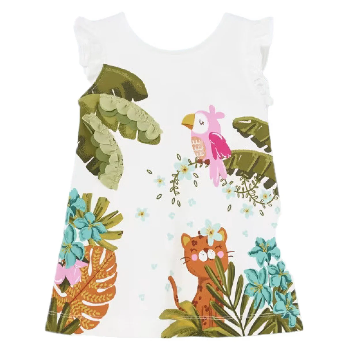 Abito MAYORAL in cotone con stampa applicata in colori a contrasto ed inserti in tessuto a contrasto, voilant applicato al giro manica.