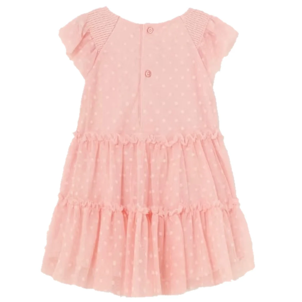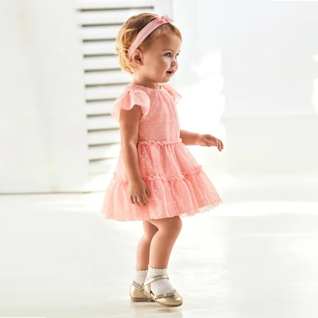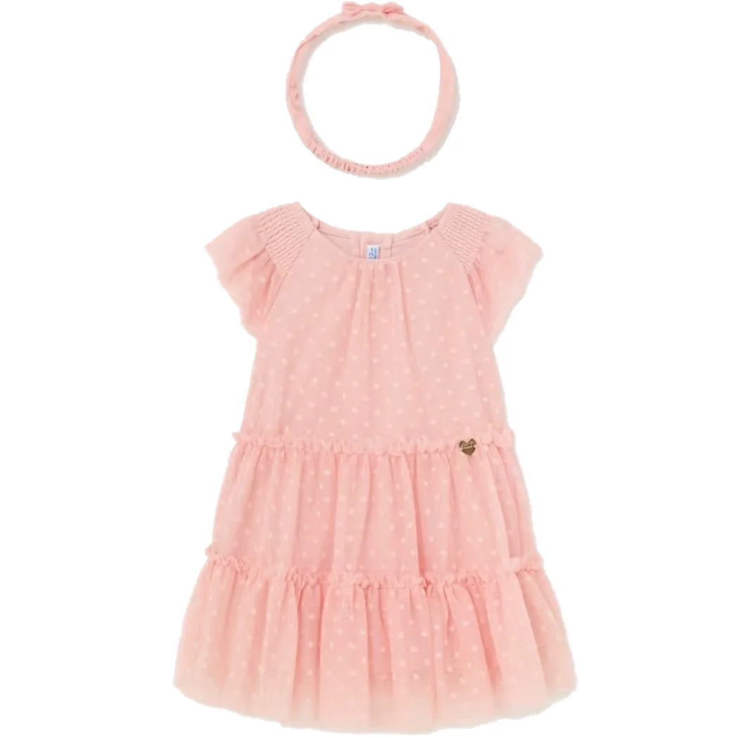 Abito MAYORAL in tulle multivelo a fantasia micropois ,chiusura sul retro con bottoncini , foderato in cotone , in coordinato fascia in tulle con retro elastico e fiocchetto applicato.