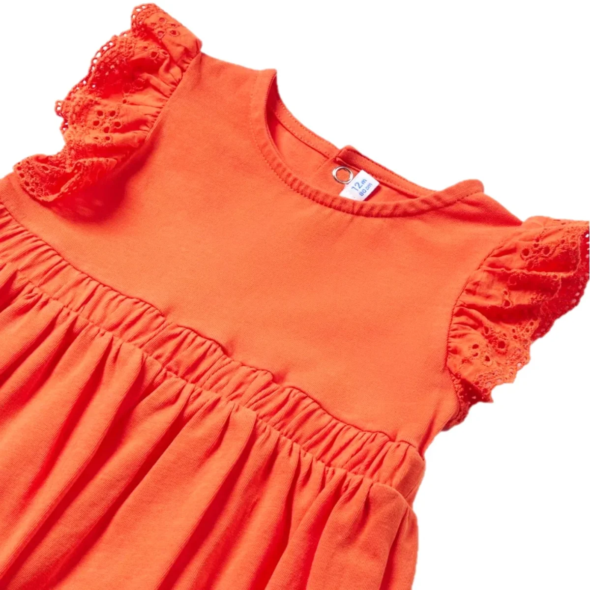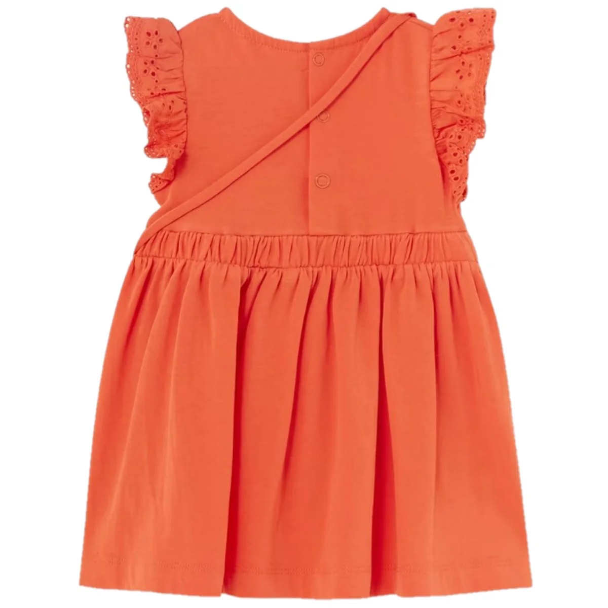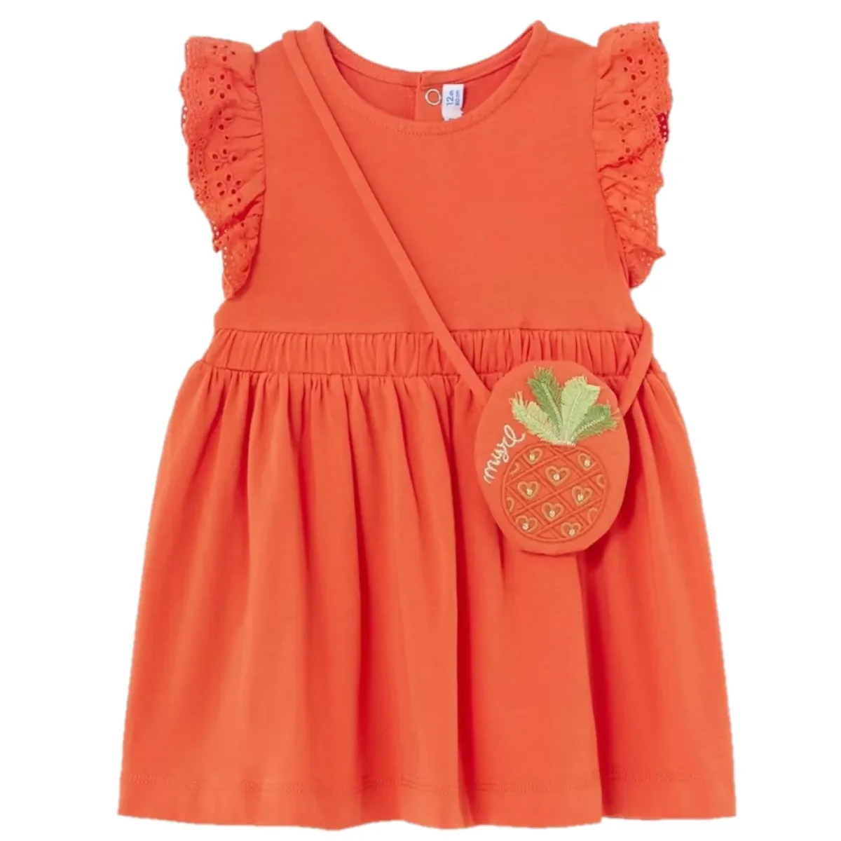 Abito MAYORAL in cotone con inserto elastico ,giromanicaa fantasia con rouches, chiusura clips sul retro, in coordinato borsetta logata a fantasia ricamata con chiusura clips.