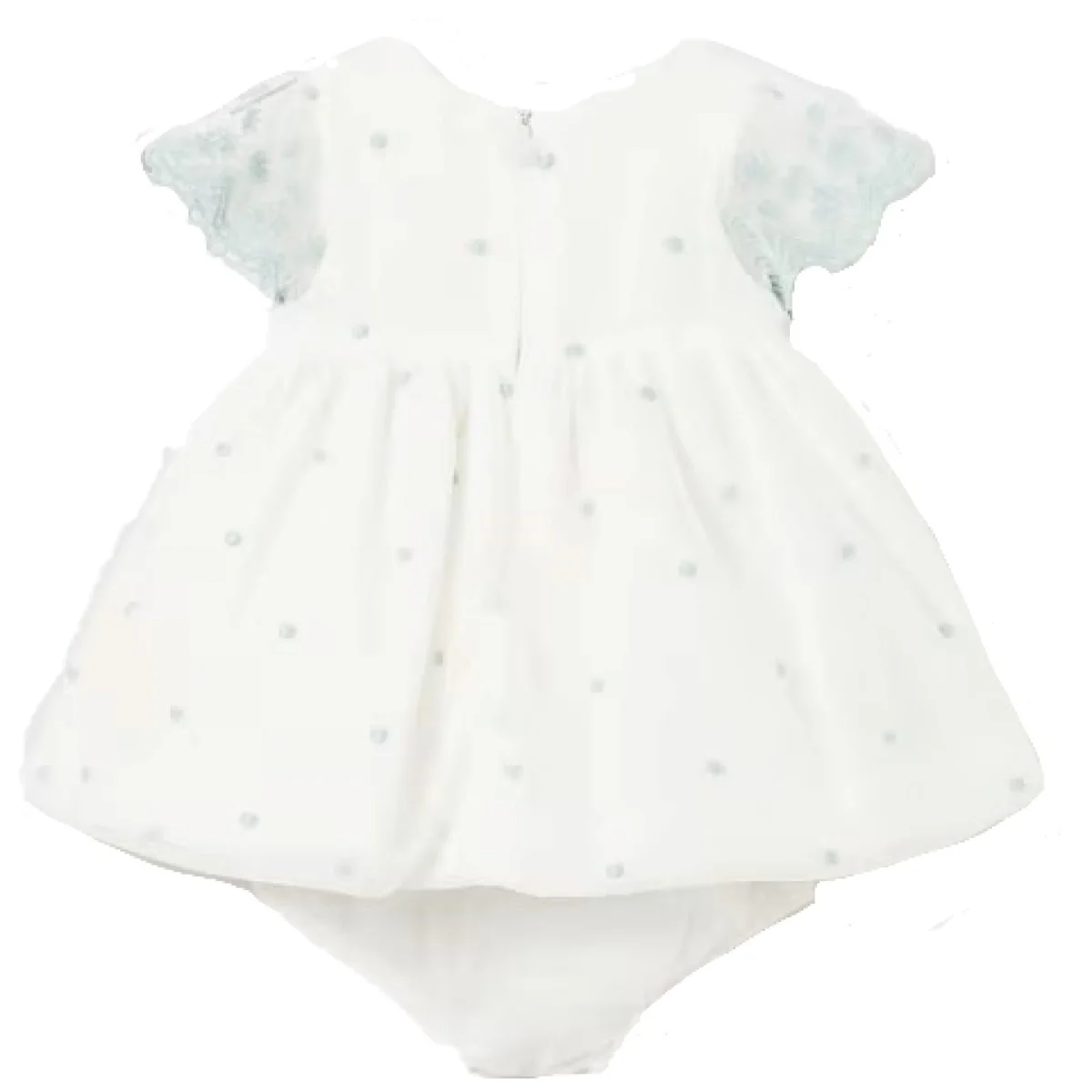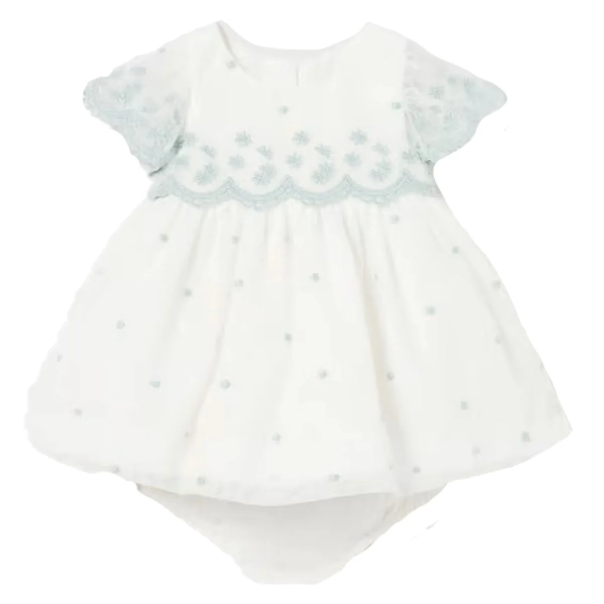 Abito MAYORAL in tessuto con tulle applicato ricamato in colori a contrasto, chiusura con zip sul retro, fodera interna in cotone. In dotazione coulotte copri pannolino in coordinato.