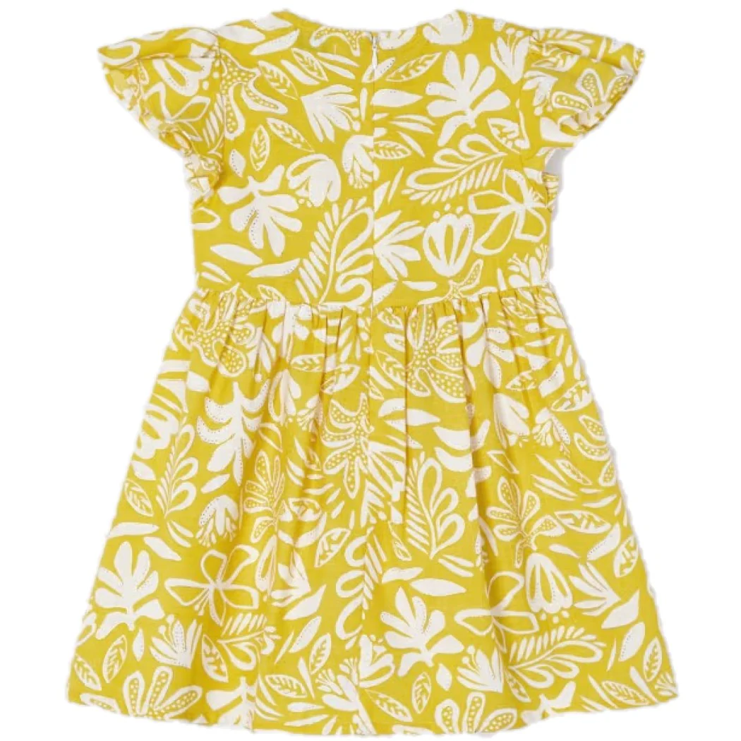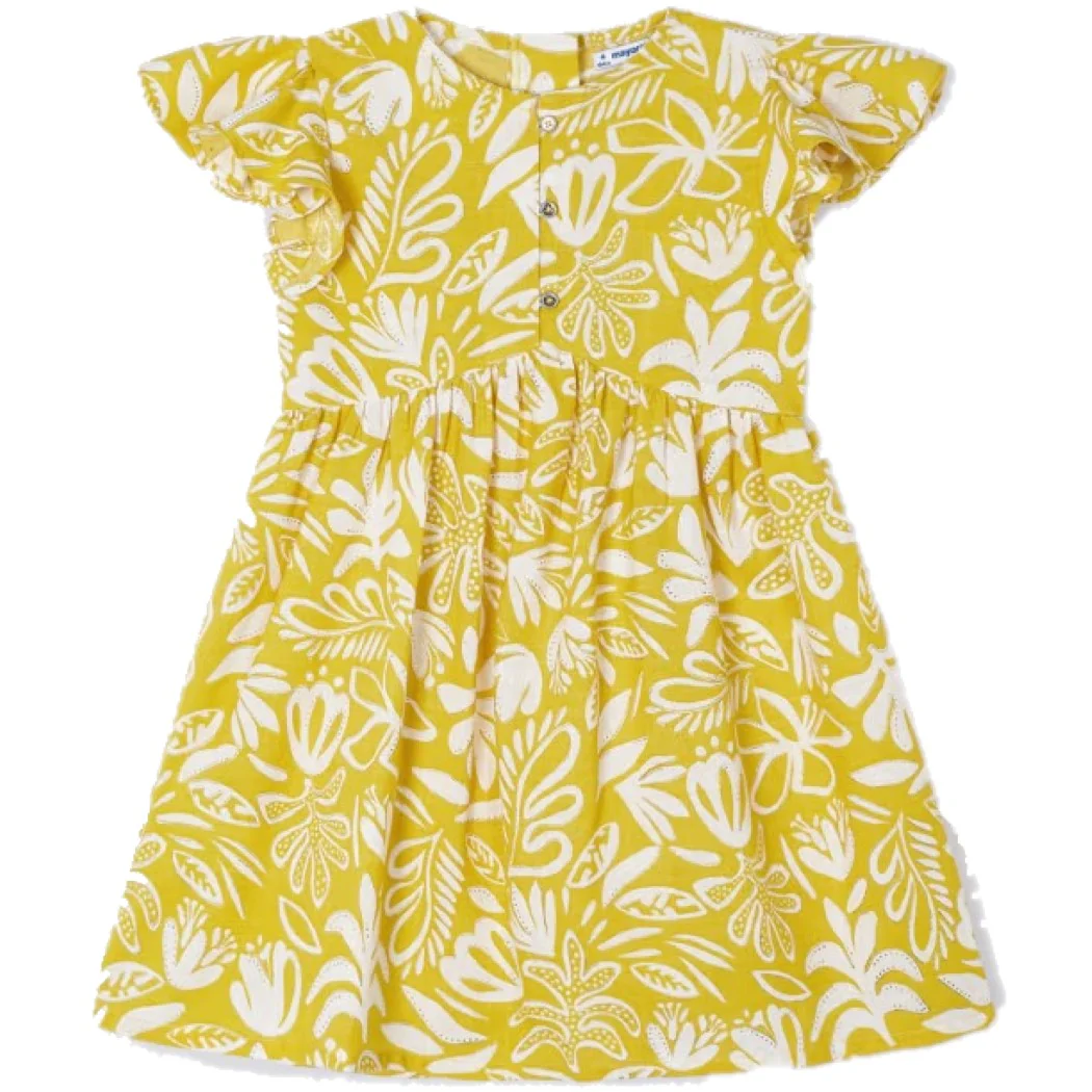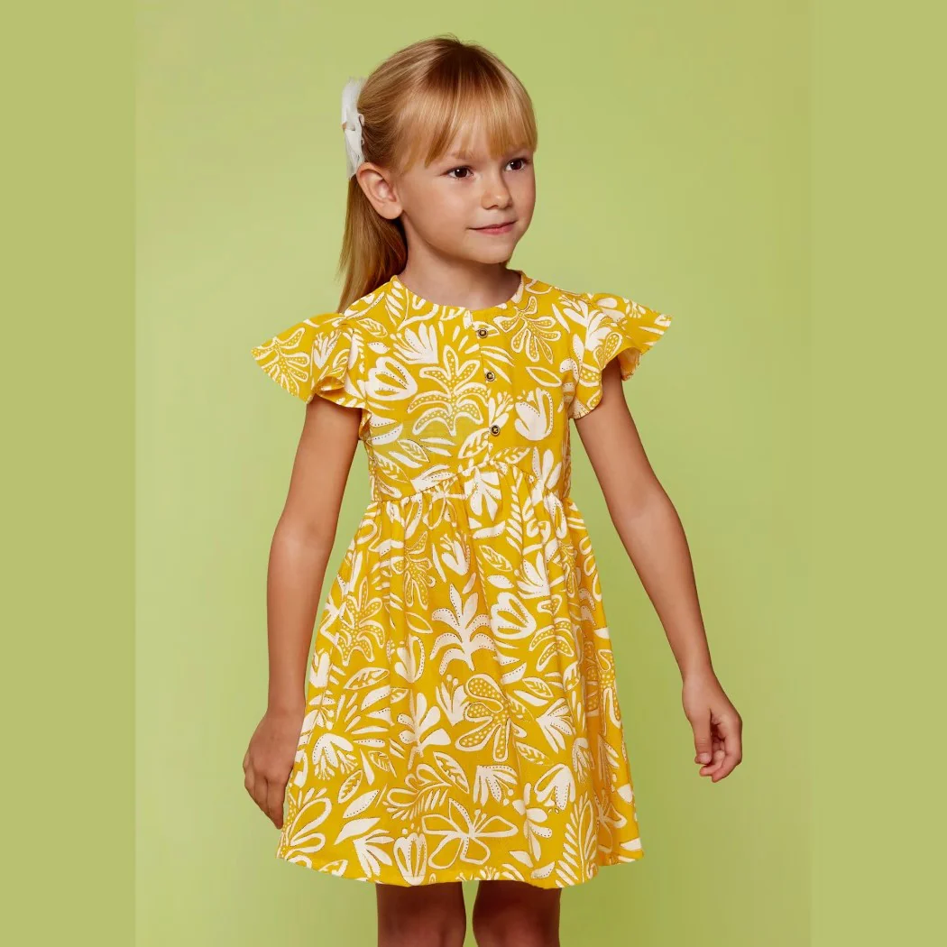 Abito MAYORAL in tessuto a fantasia tropical con chiusura bottoncini sul corpetto e zip sul retro .
