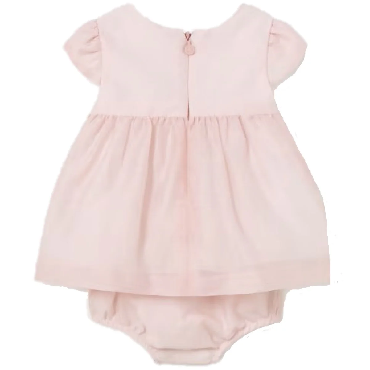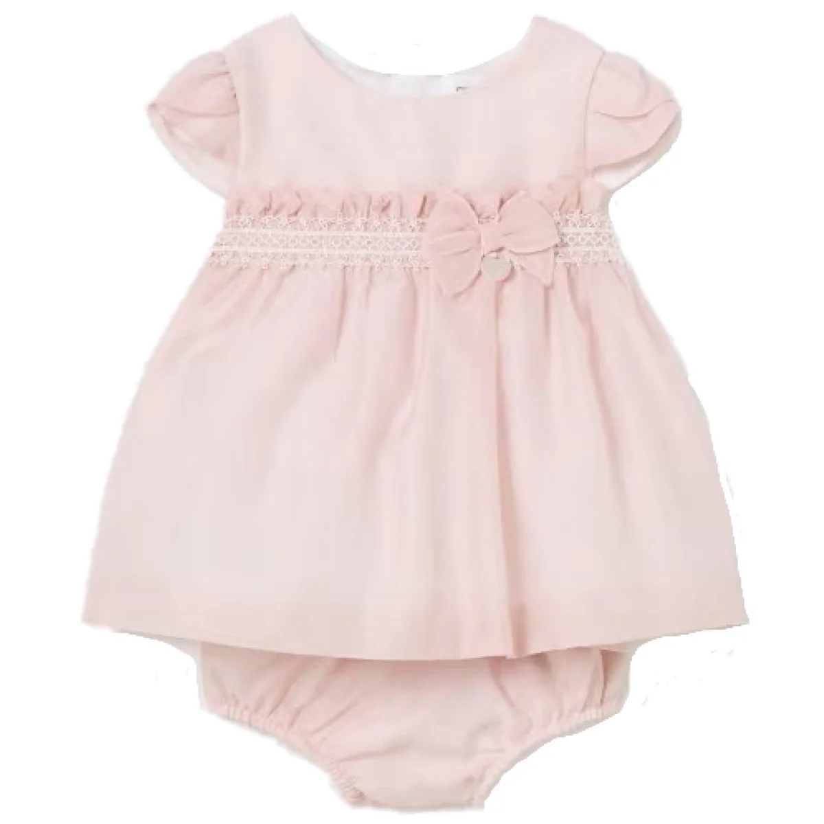 Abito MAYORAL mezza manica con inserto ricamato in vita e fiocco con logo applicato, chiusura con clips sul retro, fodera interna in cotone. In dotazione coulotte copri pannolino in coordinato.