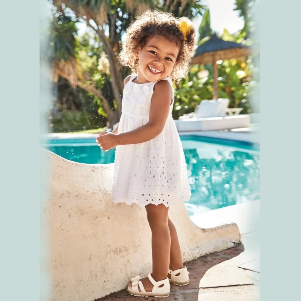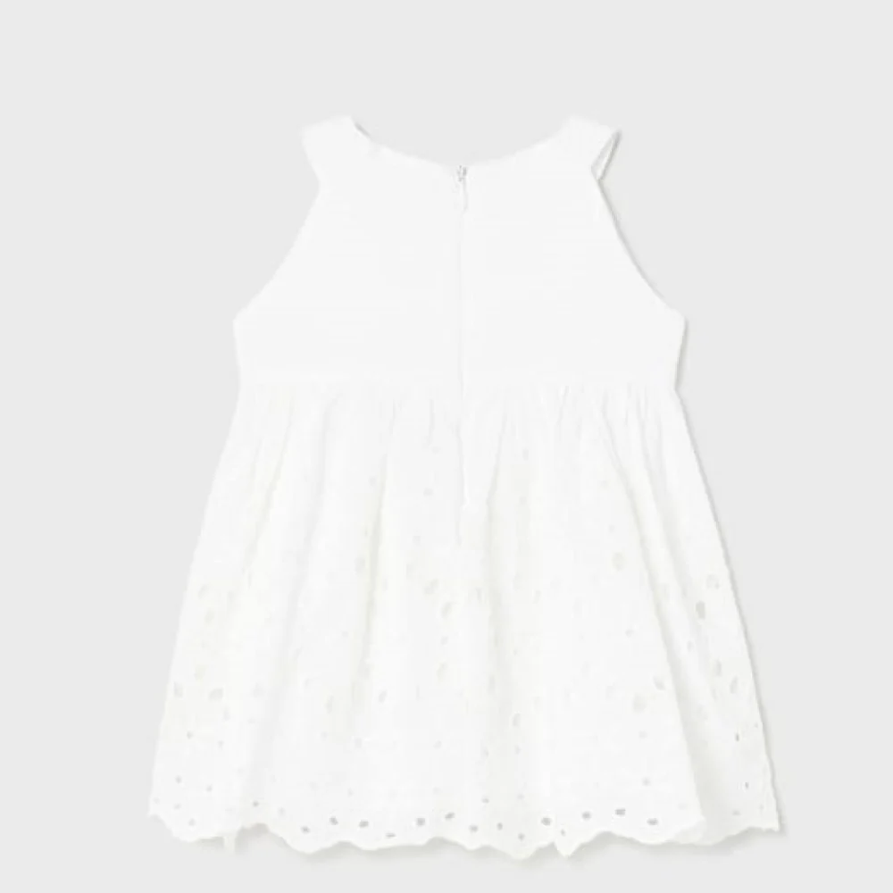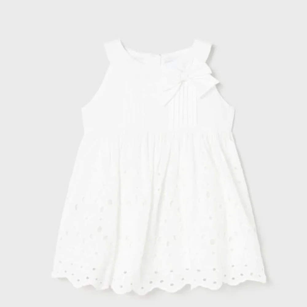 Abito MAYORAL con lavorazione in pizzo san gallo e fiocco applicato. apertura con zip a scomparsa sul retro.Esterno100% CotoneFodera100% Cotone