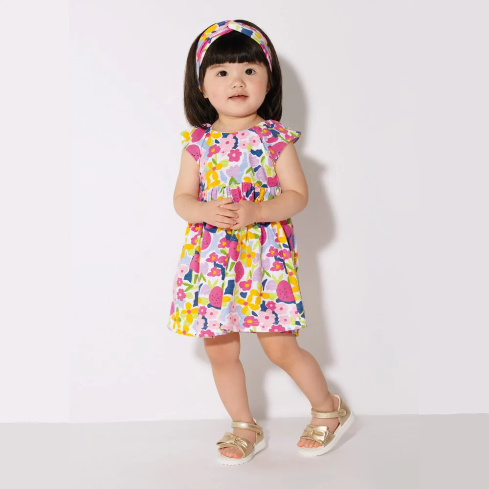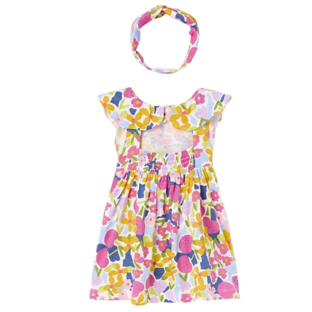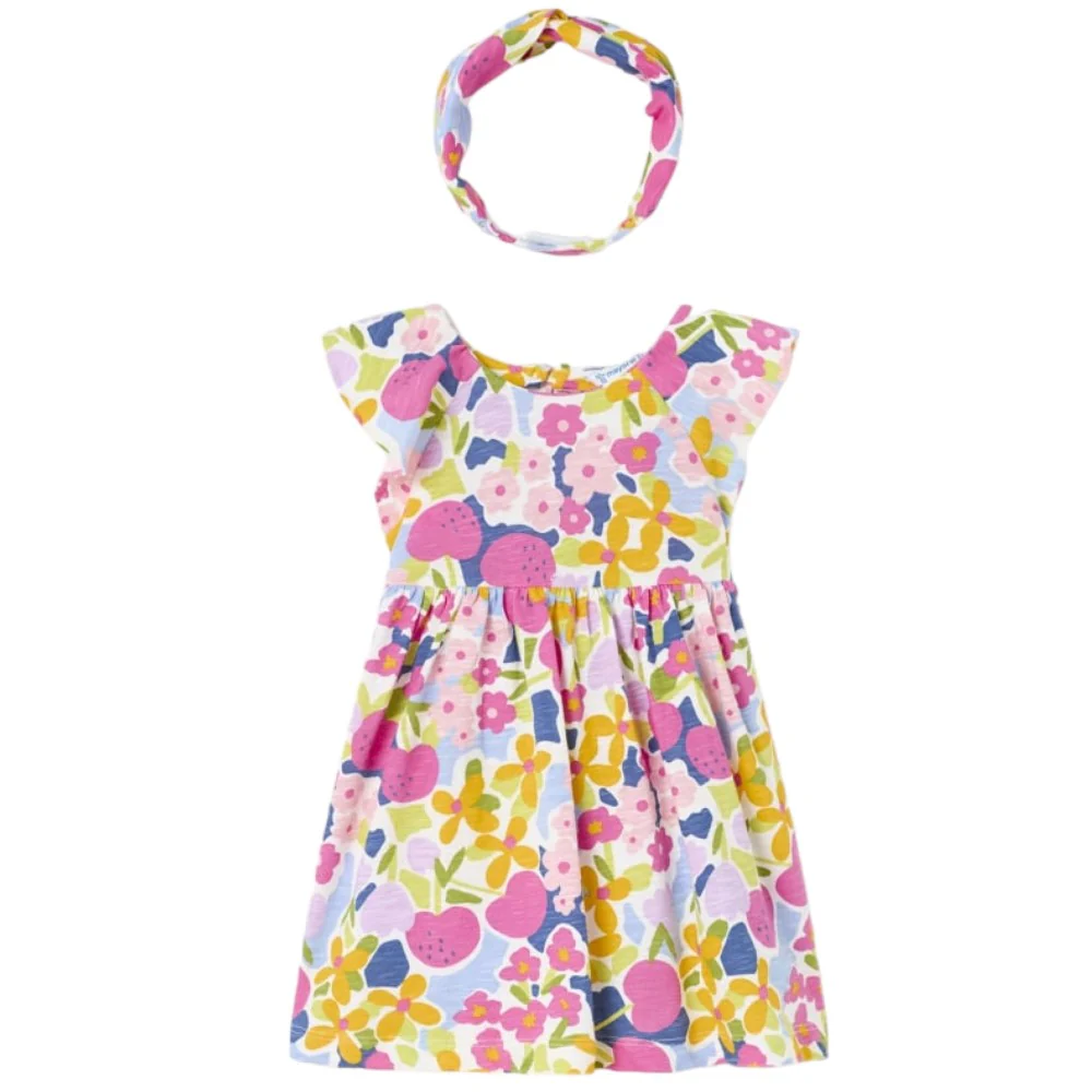 Abito MAYORAL in cotone a fantasia multicolor elastico in vita piccola apertura sulla schiena con chiusura bottoncino. In coordinato fascia elastica .