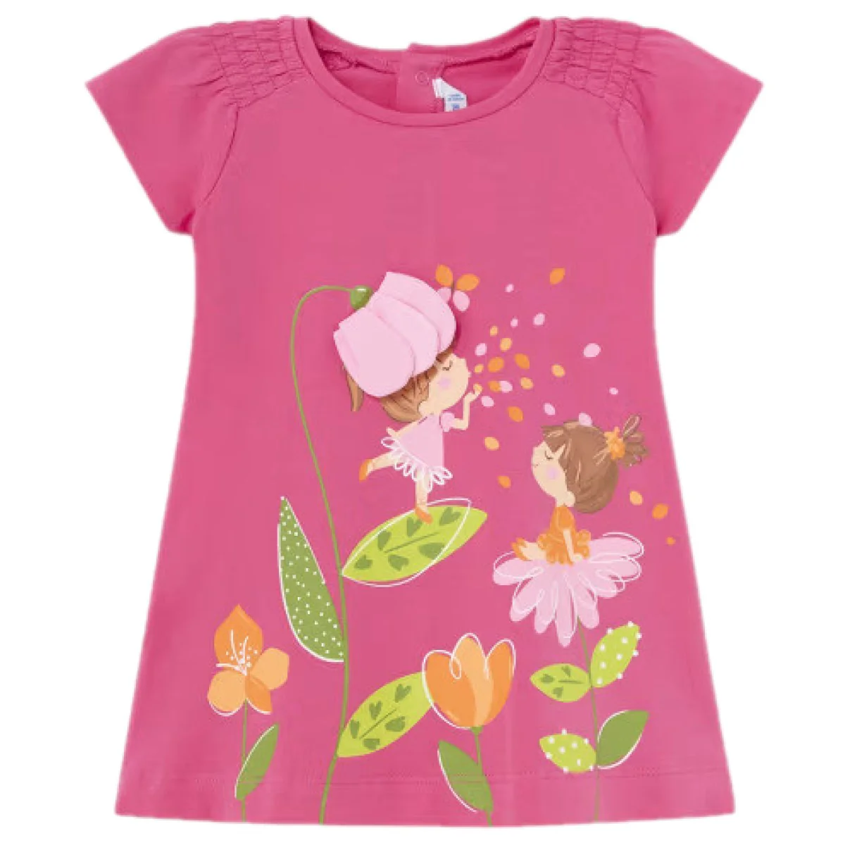 Abito MAYORAL in cotone con stampa applicata in colori a contrasto, inserti applicati in tessuto a contrasto, chiusura con clips sul retro, inserti elastici applicati.