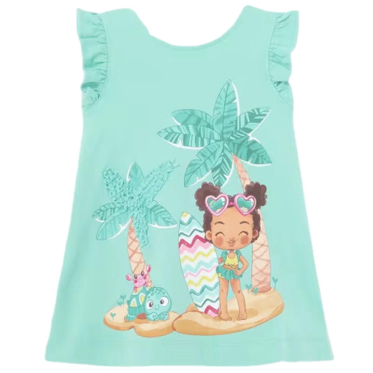 Abito MAYORAL in cotone con voilant al giromanica, stampa in colori a contrasto, glitter applicati e applicazioni in tessuto a contrasto.