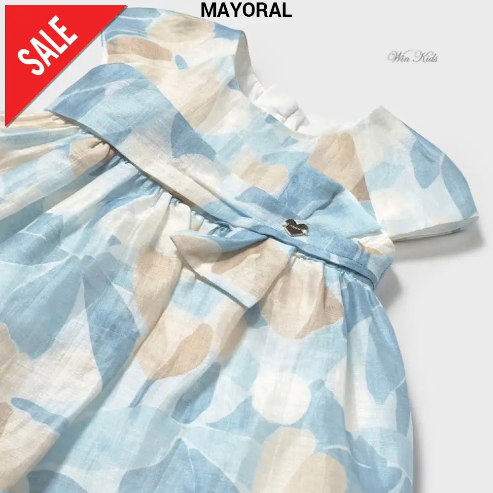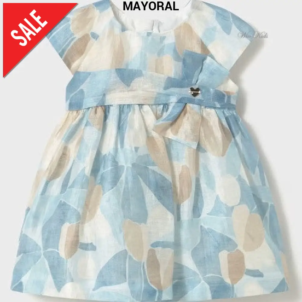 Abito MAYORAL in tessuto a fantasia azzurra con sottoabito in cotone , fiocco applicato e chiusura con zip.