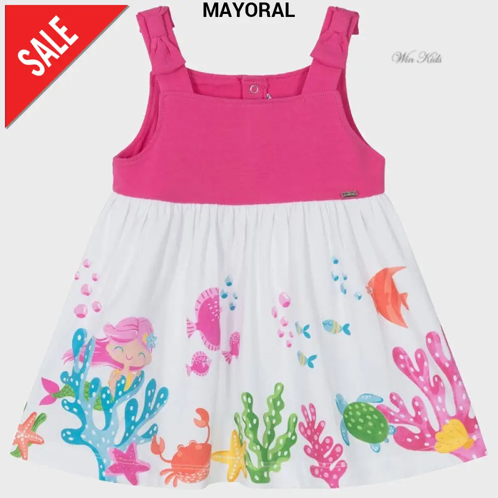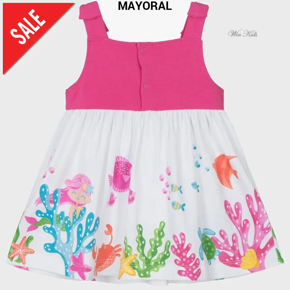 Abito MAYORAL in cotone a fantasia stampata nella parte inferiore , chiusura con clips sul retro, fiocco applicato sulle spalle.