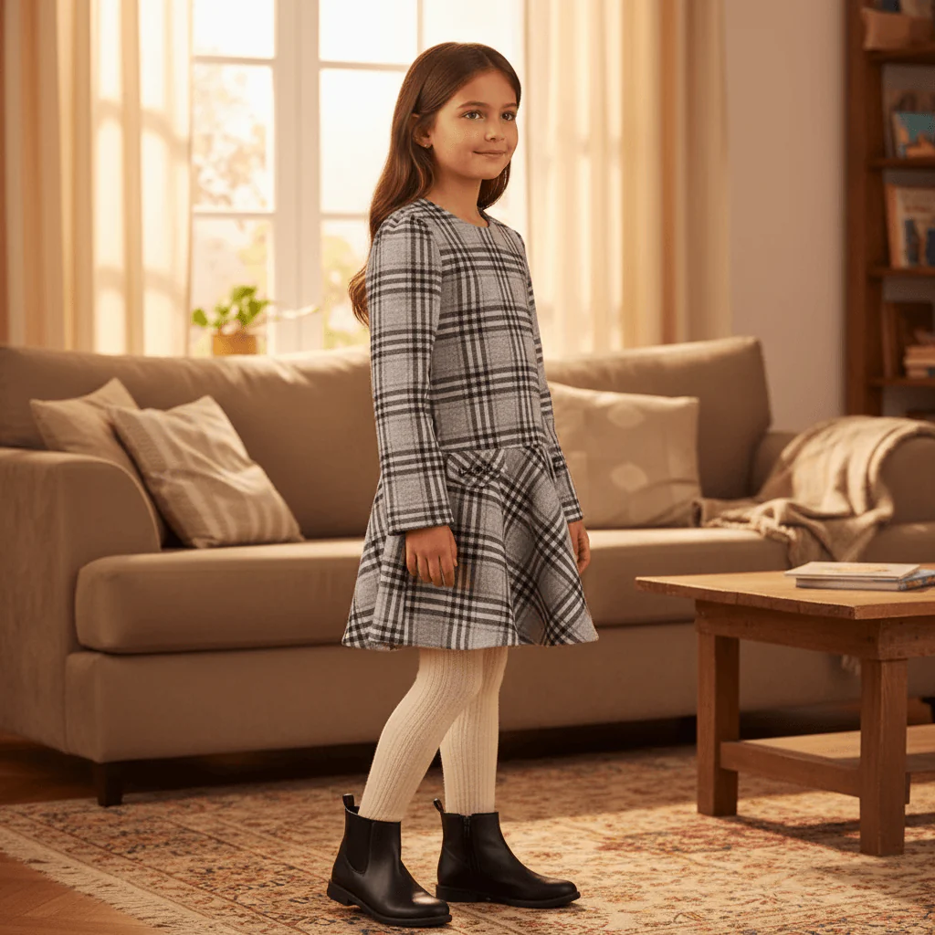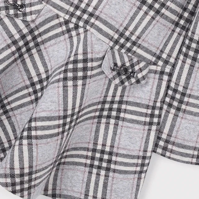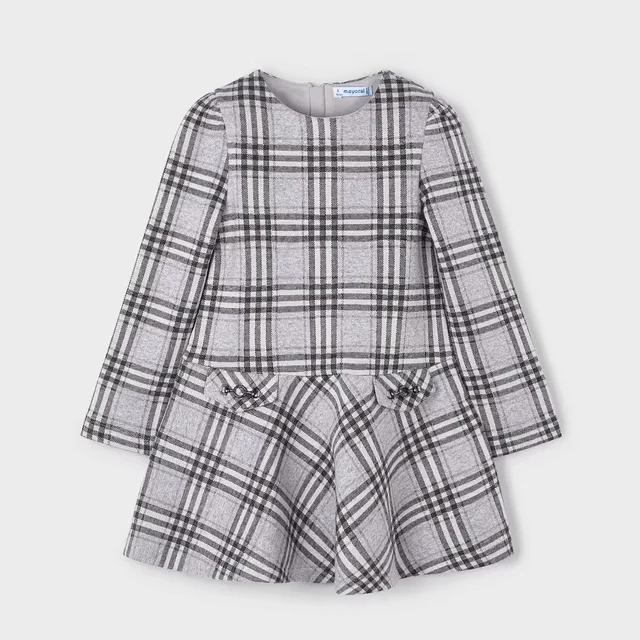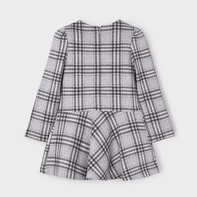 Vestito con maniche a palloncino per bambina. Girocollo. Design con taglio in vita. Apertura posteriore con cerniera invisibile. Confezione in diversi tessuti per ottenere un design unico e speciale. Finte tasche anteriori decorative. Elementi decorativi: applicazioni in metallo. Trama a quadri.